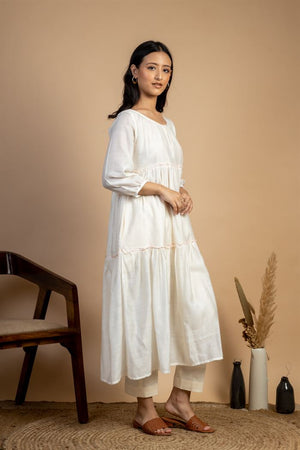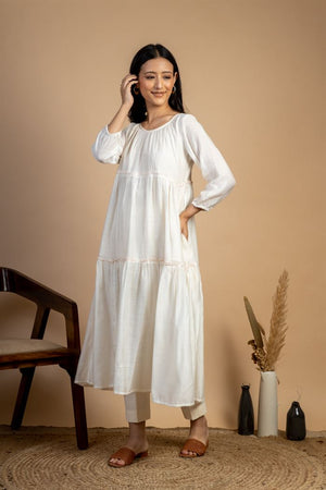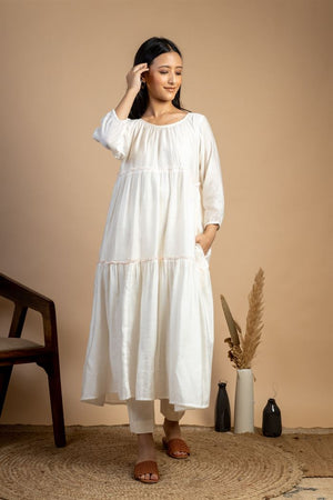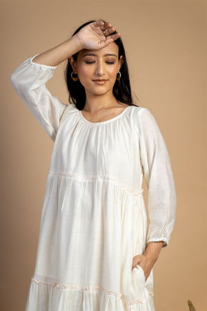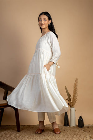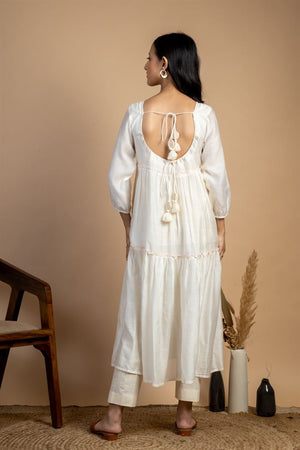 Our Ujavani dress is made in beautiful Maheshwari Silk fabric. This classic off-white tier dress has ruffle detail adorned with pink contrast thread stitch that adds to the charm of the dress. This easy-breezy dress is super comfortable and the tassel detail at the back makes you fall in love with it.