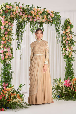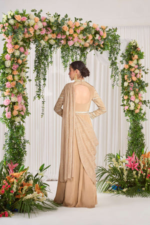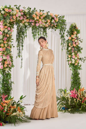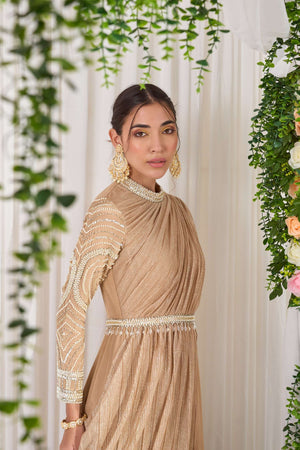 Ujwal Deep Golden Shimmer Lycra Drape Anarkali Has Embroidered Sleeves And Collar. The Outfit Is Padded And Have Side Zip Closure. The Attire Is Team With Embellished Belt With Crystal Tassel Detailing.