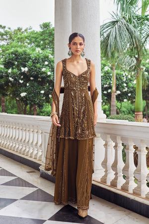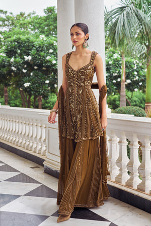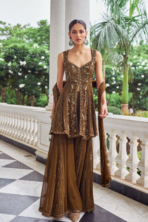 This beautiful sharara set has heavy embroidery and is made of georgette fabric. It is completed with embroided duppatta.
