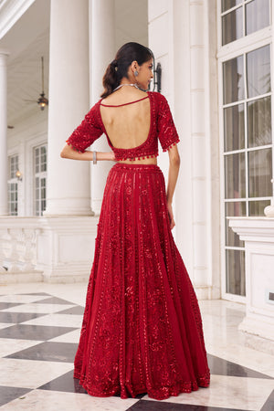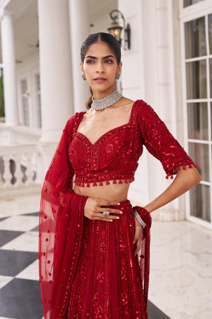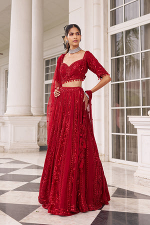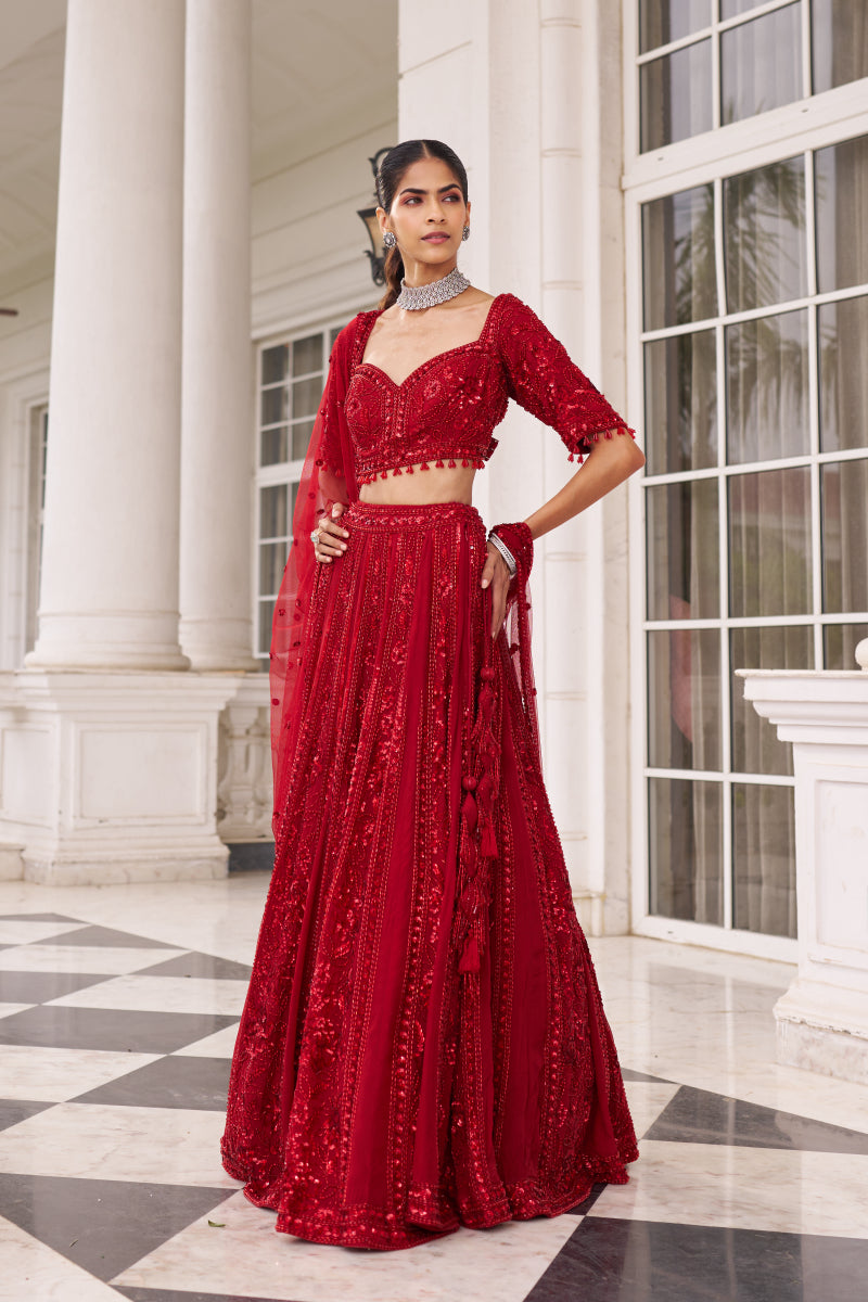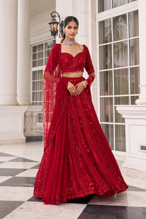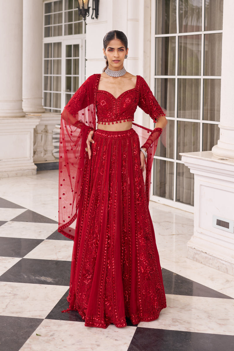 This gorgeous lehenga set in organza has a red color. The lehenga features kaliya, which is fully embroidered, and the blouse is padded with floral embroidery. The silhouette is completed with a dupatta.
