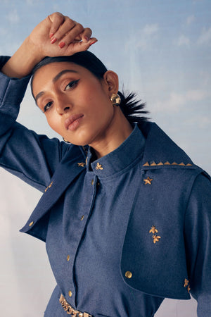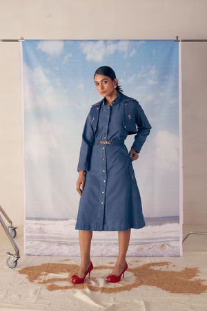 Denim Trench Jacket Dress With Gold Embellished And Detachable Belt