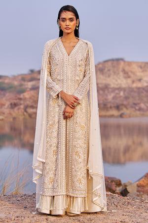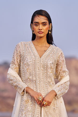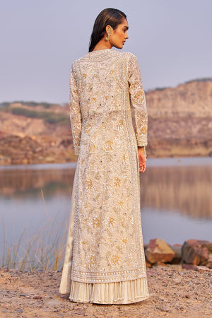 This Gorgeous Organza Kurta Lehenga Set Is Paired With Embellished Dupatta. Long Kurta Is Meticulously Crafted With Sequences, Stone And Pearls . It Has A Front Hook Opening And Side Slits. The Outfit Is Completed With Beautiful Zari Brocade Skirt.