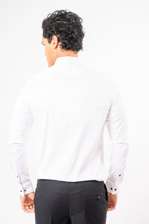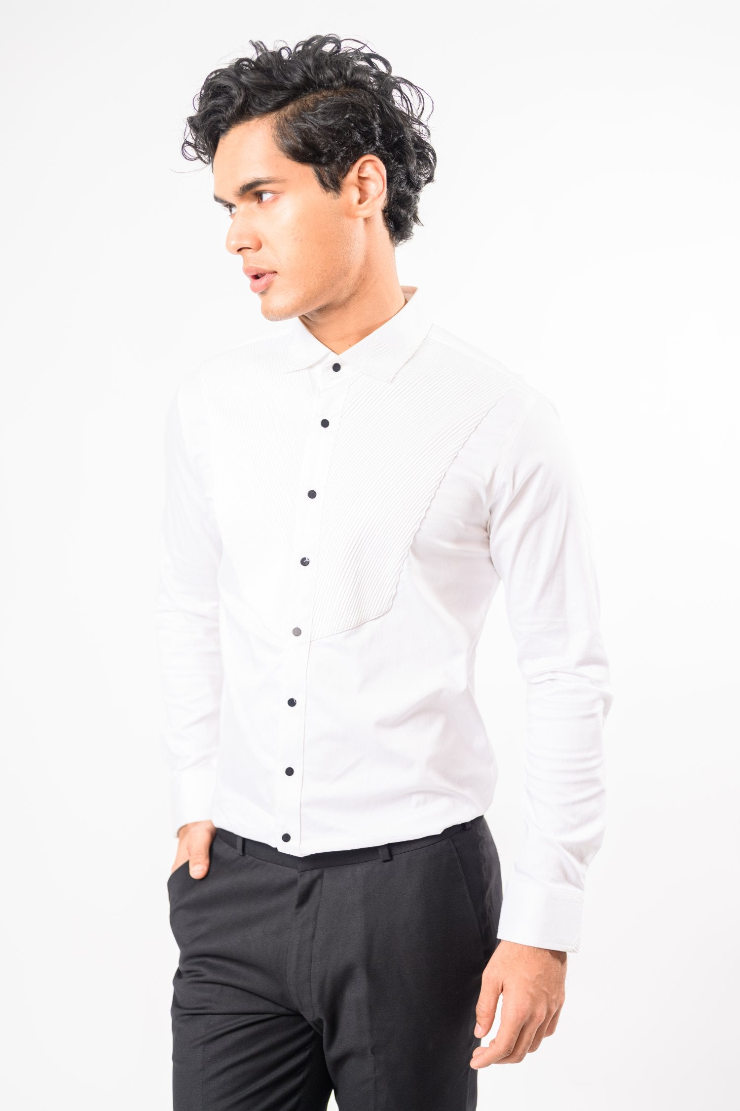 Featuring a White V Pintucks shirt cotton strech base fabric .This contains only one piece. Color of the actual garment may vary due to lighting conditions during the shoot .
