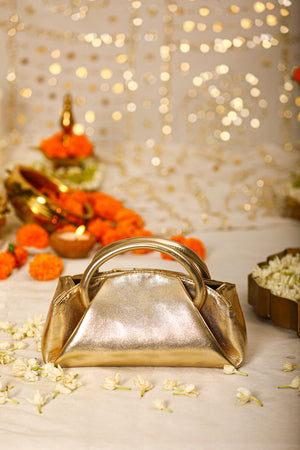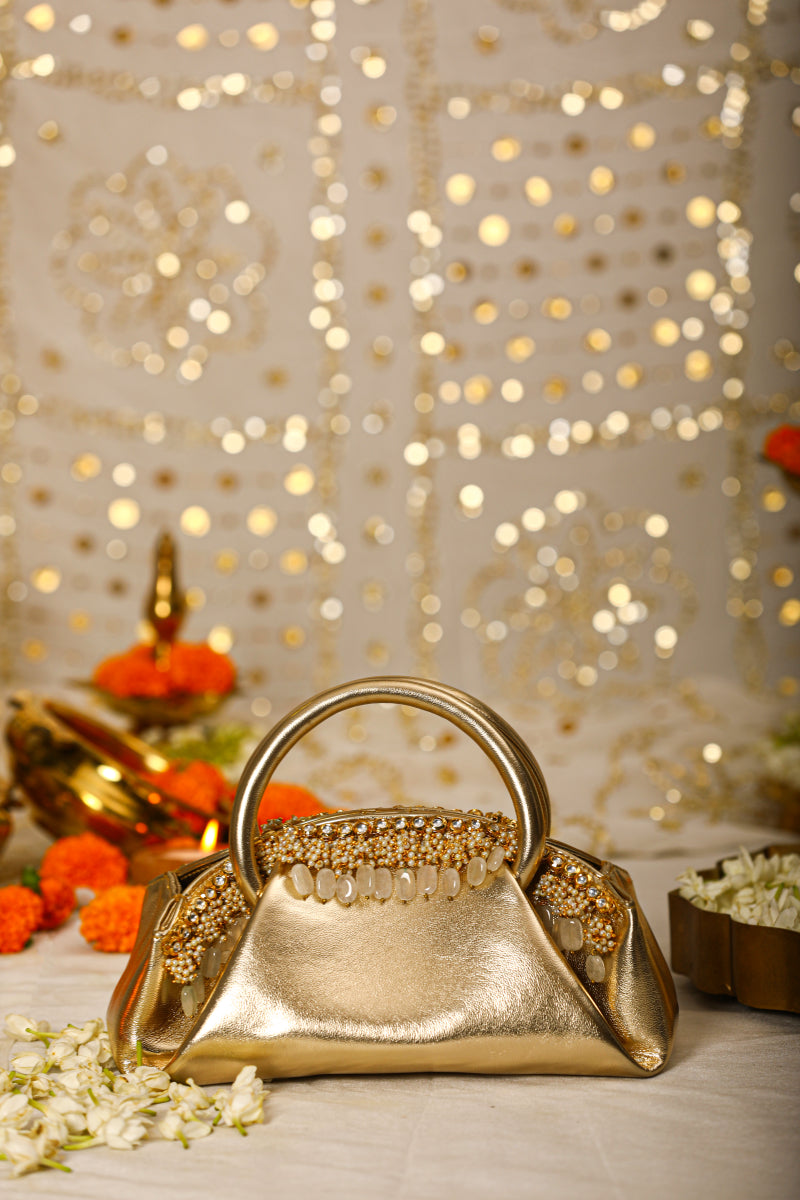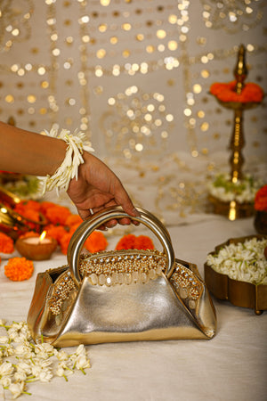 The Vahni handbag radiates contemporary elegance with its structured silhouette and lustrous faux leather body. Lined with soft dupion fabric, this piece features a richly embellished top border adorned with ivory toned beads, shimmering sequins, and dainty pearl detailing. The dual circular handles add a touch of vintage sophistication while ensuring comfortable grip. Subtle sheen and versatile size make it a standout for festive occasions, cocktail evenings, or weddings. Minimalist yet regal, the Vahni is a modern classic with timeless ethnic flair.