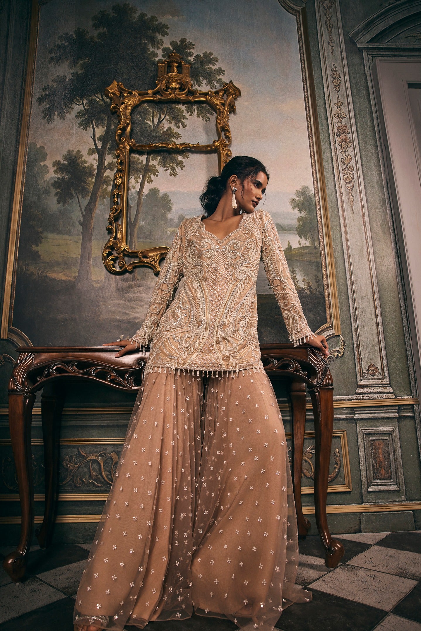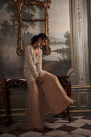 Immerse yourself in timeless grandeur with this beige and ivory garara set, a celebration of intricate craftsmanship and regal elegance. The kurta is beautifully adorned with hand embroidery, enhanced by delicate tassel details throughout, creating graceful movement and texture with every step. A unique neckline adds a modern edge, making the ensemble as distinctive as it is sophisticated. The look is completed with a net garara, richly embroidered to reflect couture artistry while maintaining a delicate, ethereal quality. Its soft, flowing silhouette balances the structured kurta, resulting in a harmonious blend of tradition and contemporary finesse. Perfect for weddings, festive celebrations, and evening receptions, this ensemble radiates understated opulence. Designed for the modern woman who appreciates heritage reimagined through a luxurious lens, this garara set is a true heirloom piece. Pair with statement earrings and metallic heels for an unforgettable finish.