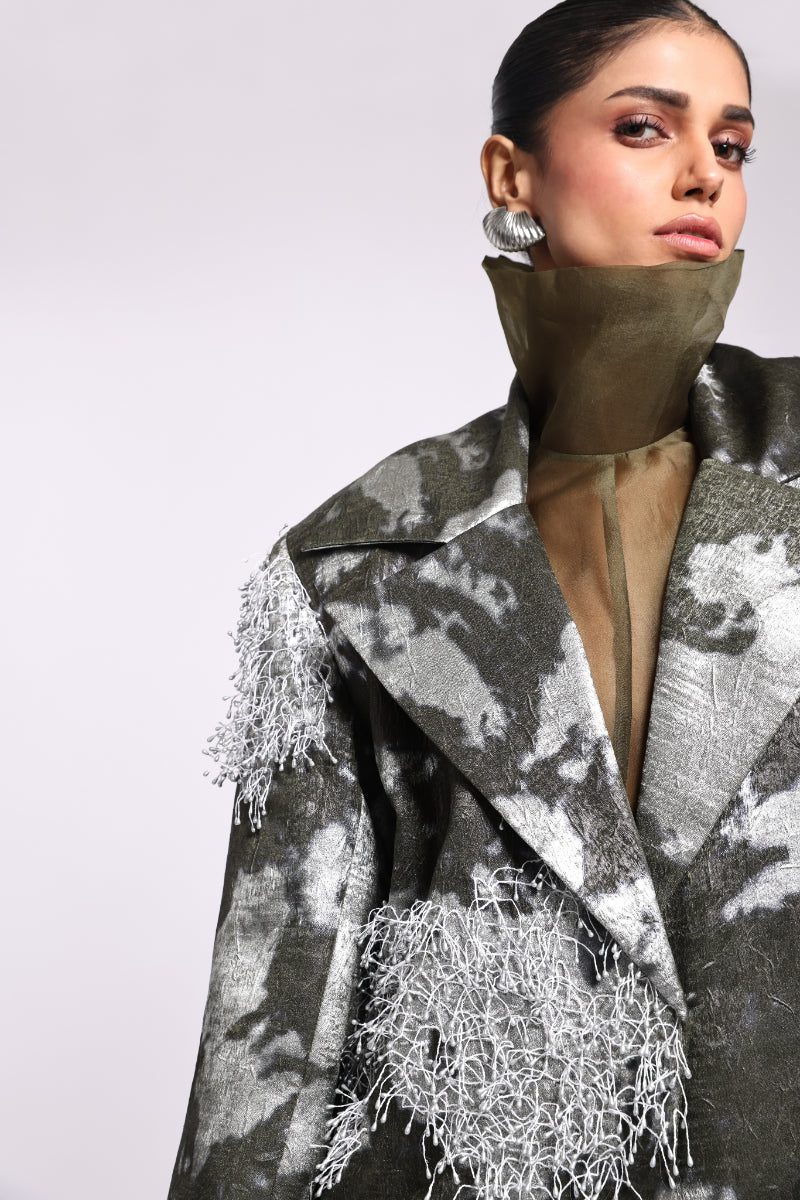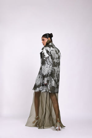 Printed Blazer With Hand Embroidery Paired With Sheer Organza Layer Beneath