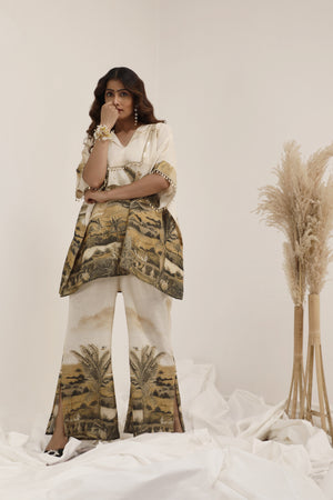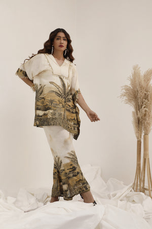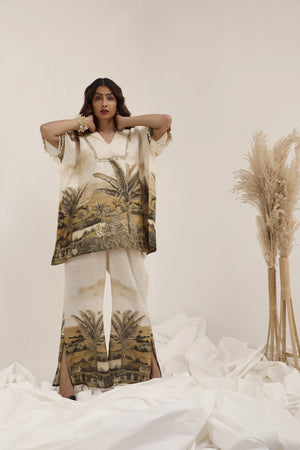 The print for this Kaftaan set is inspired by the beauty of jungles and trees, the