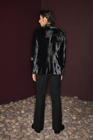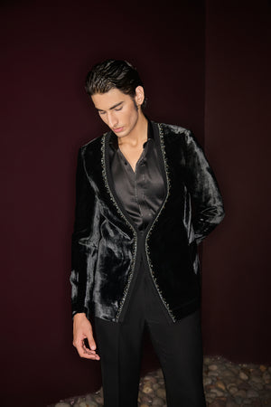 A broad neck single breasted silk velvet tuxedo beautifully embellished with shiny materials, paired with an intricately embroidered shirt and tailored pants