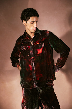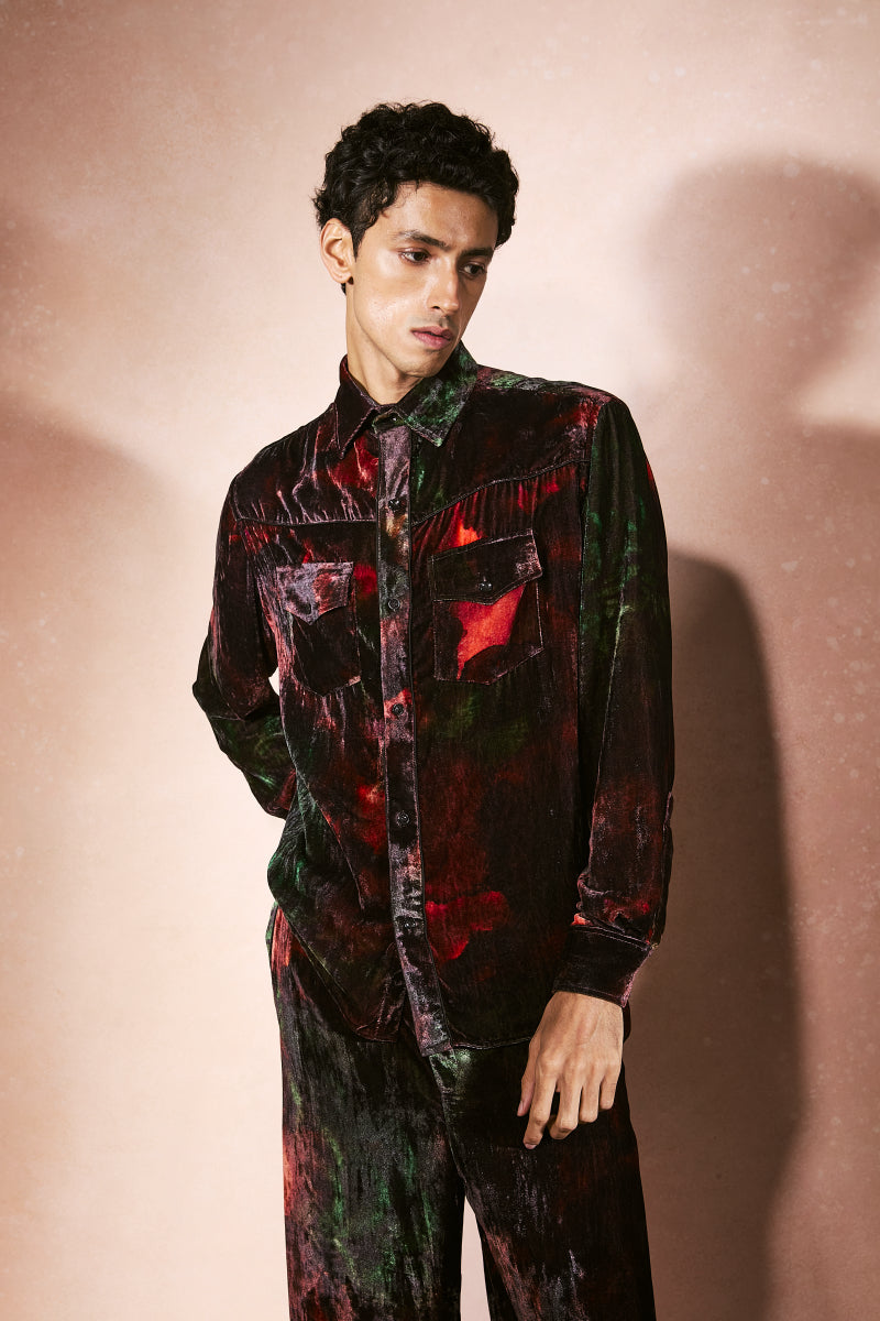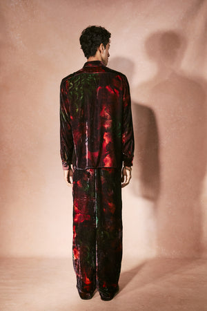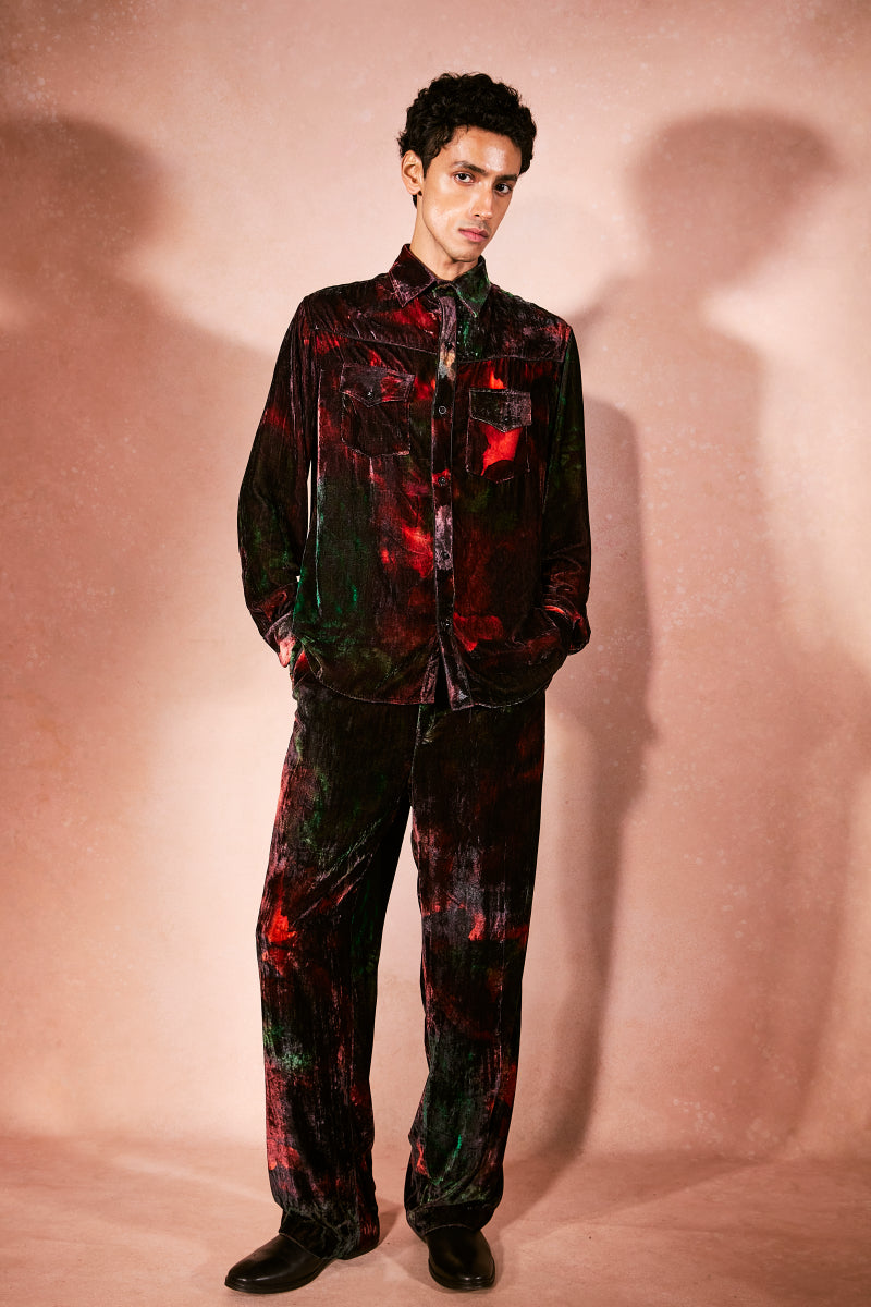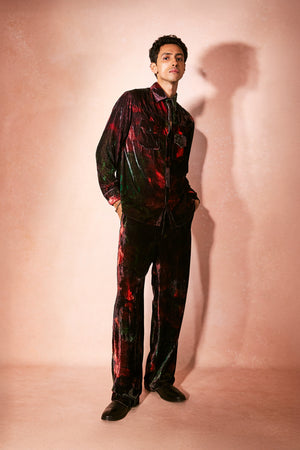 A statement velvet coord set in abstract flame print. The full-sleeve shirt is structured yet easy, paired with straight-fit trousers in a matching palette. Bold, textural, and transformative, luxury menswear for evenings that demand presence.