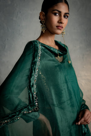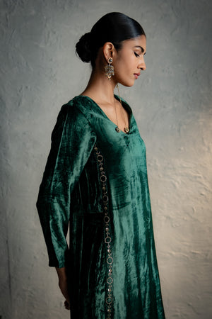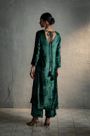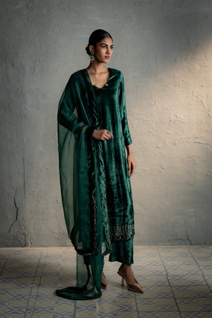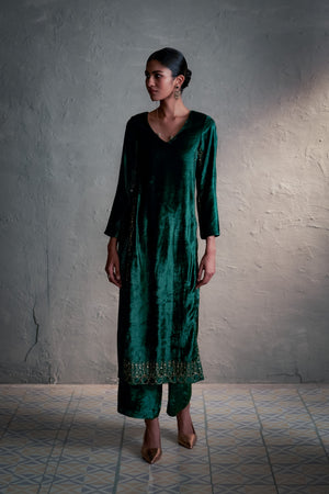 A velvet kurta set in a straight-fit silhouette, featuring an intriguing side-slit detail, a sleek side band on the bodice, and a back tie-up for a structured yet graceful look. Intricate embroidery adorns the long slits, sleeves, and the front hem, paired with loose palazzos for effortless ease. Available in two rich colour options, one styled with an embroidered velvet stole, and the other with an organza dupatta edged in velvet for a soft, flowing drape.
