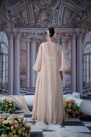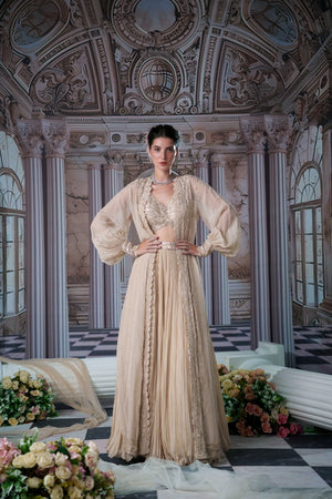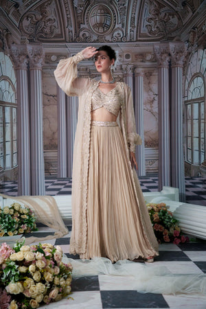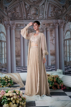 This Gorgeous Nude Colour Lehenga With Beautiful Long Cape Has Full Embroidered Blouse And Over It Has Organza Long Cape