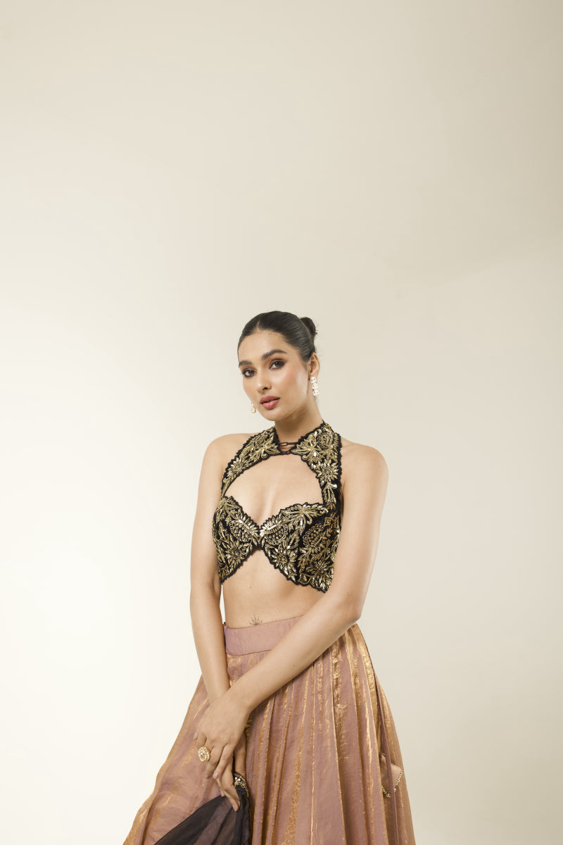 A sultry symphony in Black and rose gold — this hand-embroidered blouse with sculpted cuts pairs effortlessly with a flared skirt, organza dupatta with hand embroidered border, blending softness and structure in a silhouette made to mesmerise.
