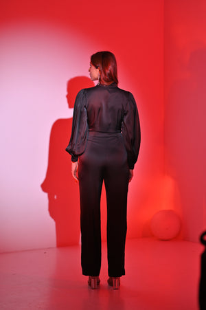 .You'll love this stylish and comfortable jumpsuit with its stunning bishop sleeves, V-neck, and hand-embellished sequin panel accentuating the neck on luxurious satin fabric. It's a true standout piece that's sure to turn heads.
