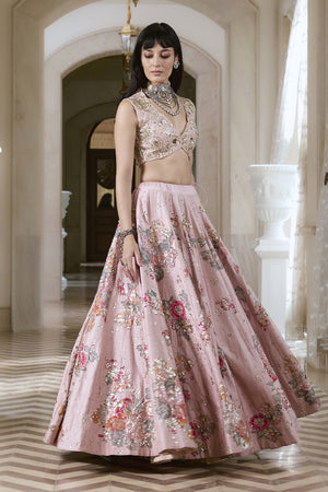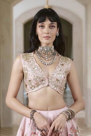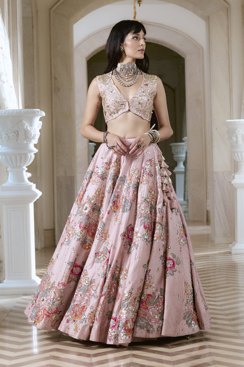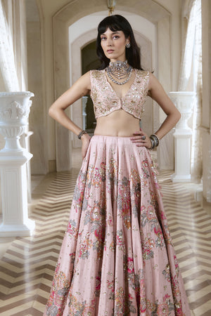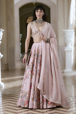 A baby pink lehenga set featuring a deep-neck blouse, fully embroidered with intricate floral motifs and finished with delicate scalloped edges on all sides. The lehenga showcases multicolored floral prints, highlighted with fine embroidery, creating a harmonious blend of color and craftsmanship. Paired with a sheer organza dupatta, adorned with a scalloped finish, this ensemble exudes timeless elegance.