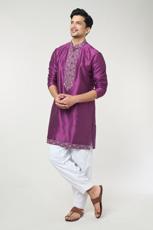 Violet cotton silk based kurta, enhanced with floral thread and sequin emroidery, paired with an off white cotton based pathani pants.