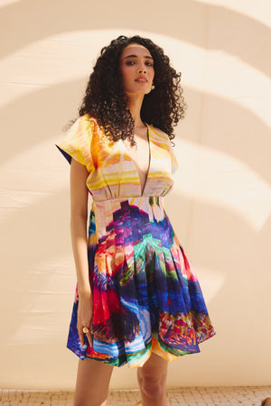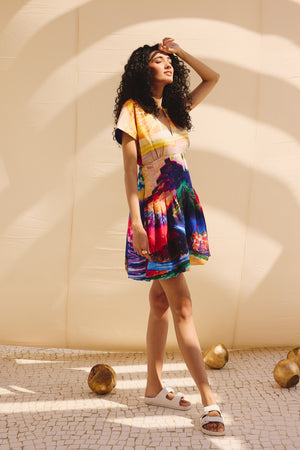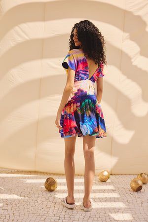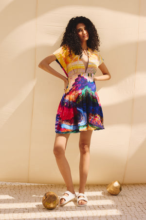 This dress features a deep V-neckline and short loose sleeves that provide a relaxed yet