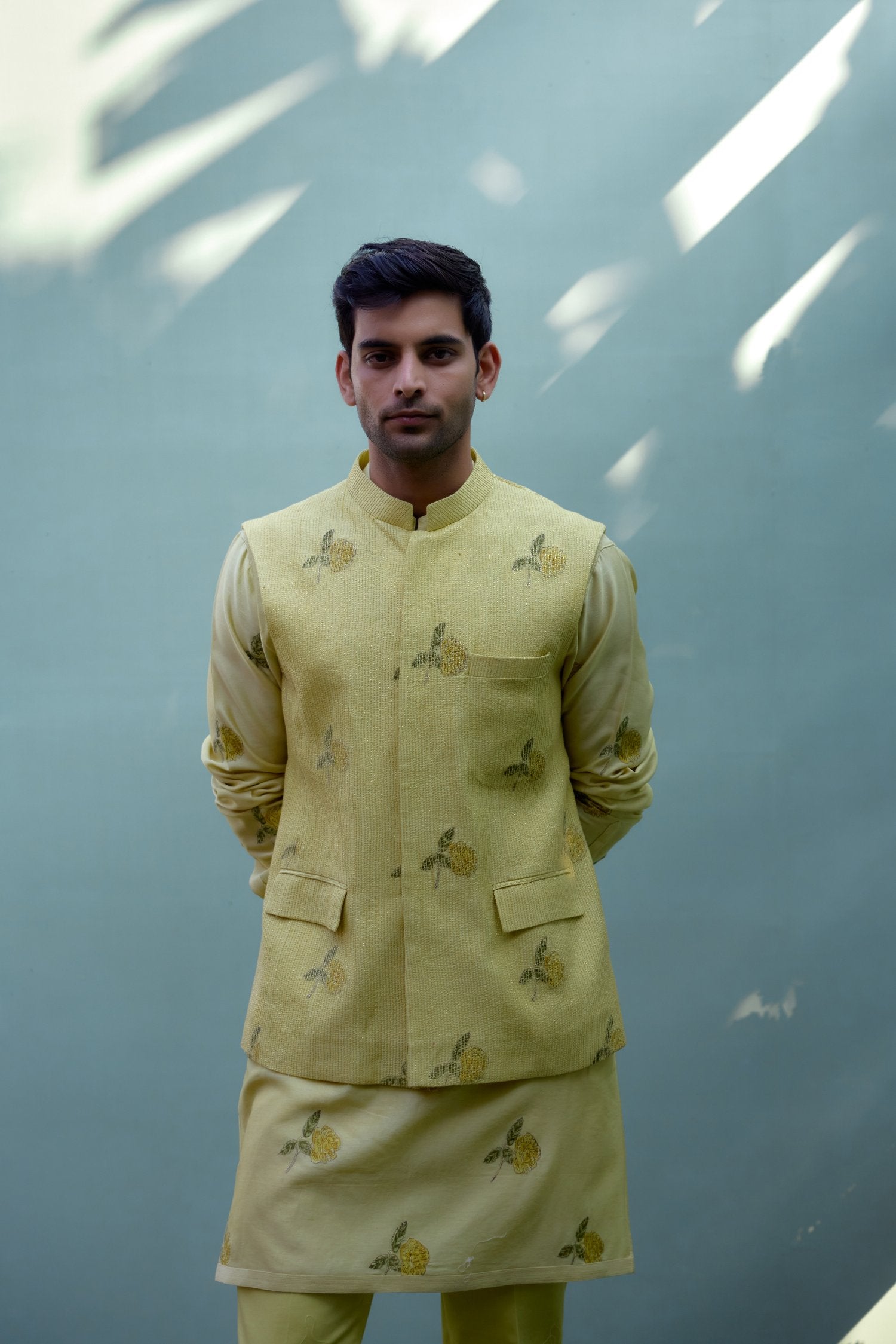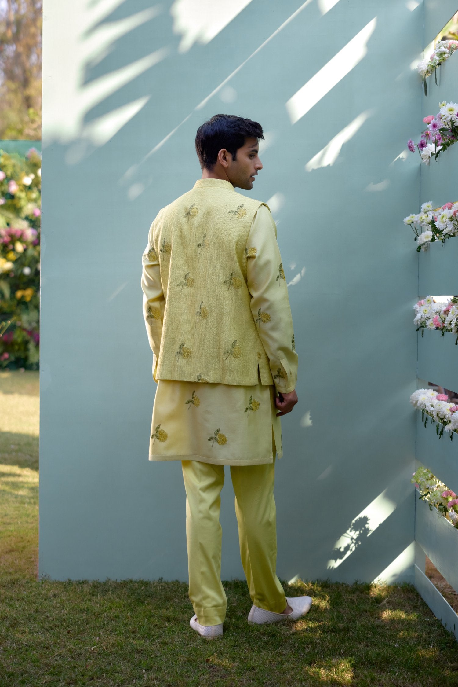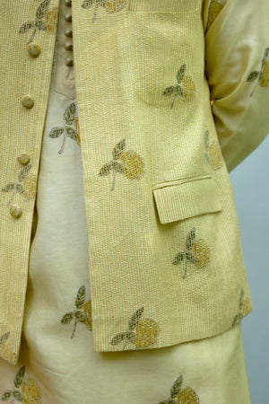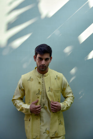 Canary yellow hand block printed dori quilted silk chanderi waist coat with printed kurta and trousers