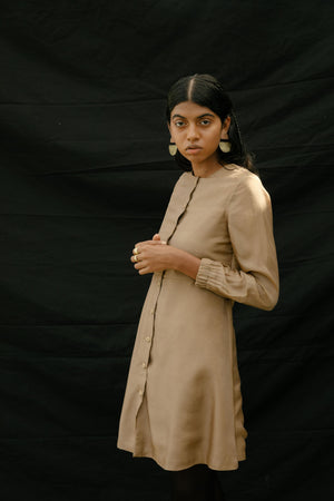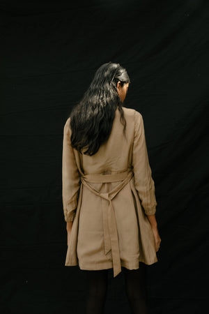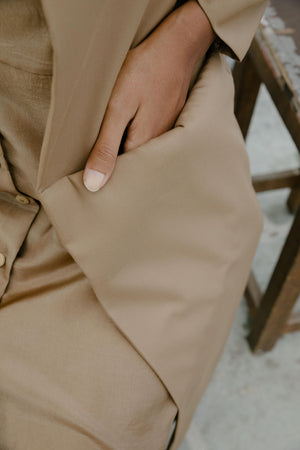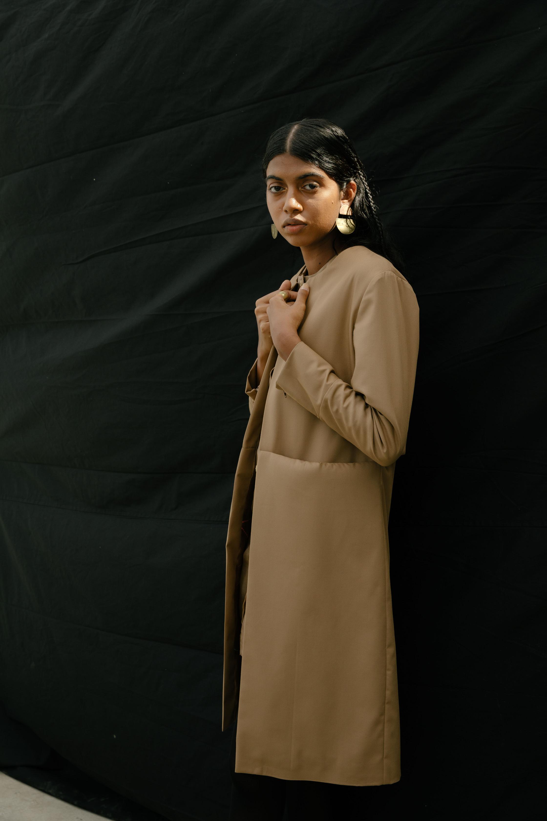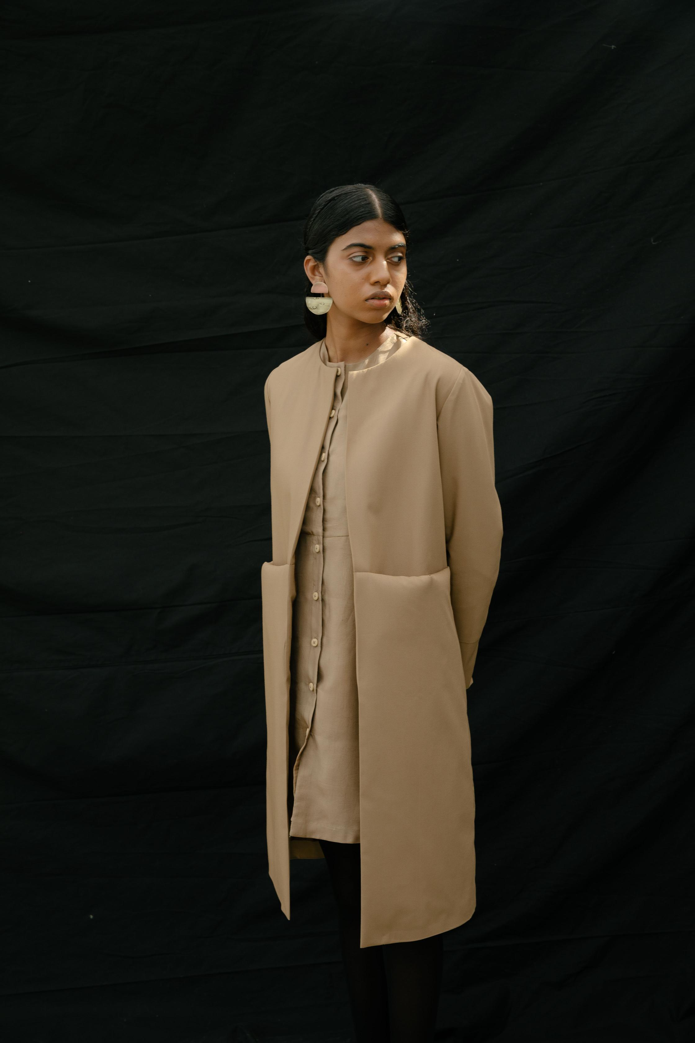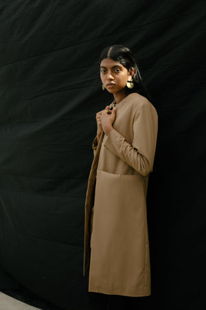 Walnut Beige open-front coat with surprise pockets, features horsehair body structure.