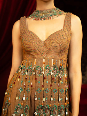 Add flair to your wardrobe with this stylised walnut brown peplum kurta, inspired by Indian gypsy fashion, paired with a sharara pant featuring a bold color-block hem in crimson red and space blue. The look is completed with an innovative neckpiece and tassel-detailed dupatta for a playful yet elegant appeal.