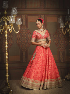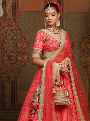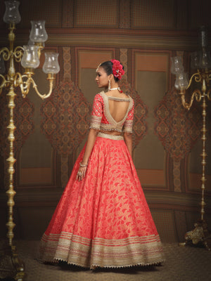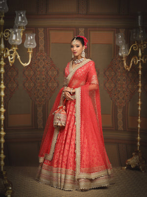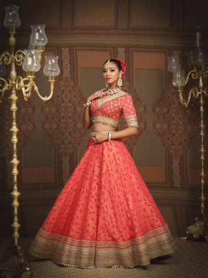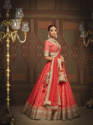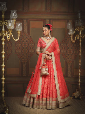 Embark on a journey of bold elegance with our Watermelon Red and Red cotton Shimmer Chanderi lehenga. Adorned with intricate Gota, Dori and Badla work, this ensemble is a harmonious blend of traditional charm and contemporary. A delicate net dupatta gracefully accompanies the lehenga, adding a touch of ethereal beauty. The silk chandrri blouse features a chic V neckline. The dynamic interplay of watermelon red and red creates a symphony of passion and vibrancy, reflecting captivating presence.