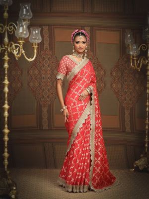 Radiate charm in our Watermelon Red and Rani Pink Chanderi Saree, enriched with delicate Gota, Dori and Badla work. The watermelon red exudes a refreshing and lively vibe, while the Rani Pink adds a touch of timeless elegance. Accompanying this saree is a Silk chanderi blouse, featuring a scalloping V neckline that adds a touch of modern allure.