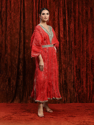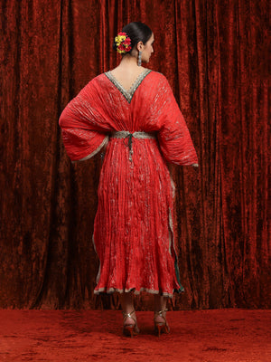 Featuring a WaterMelon Red & Emerald Green Crinkle kaftan in Lurex Cotton and with fine gota, dori, badla work.