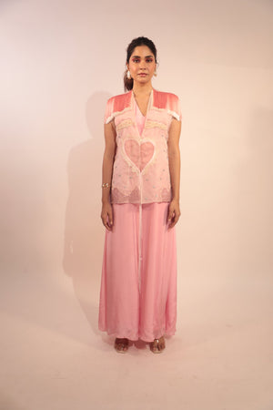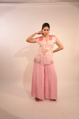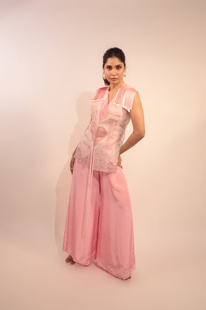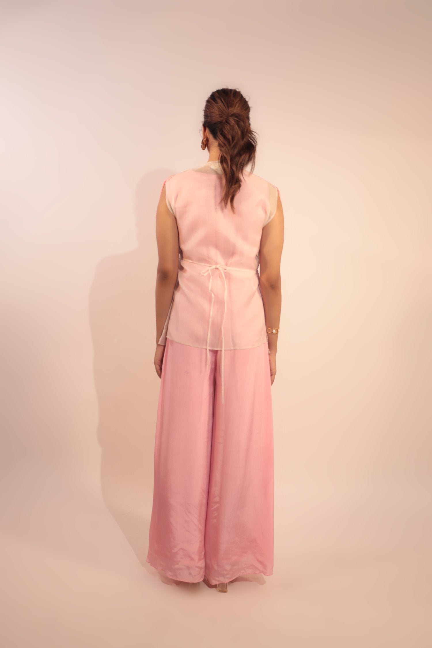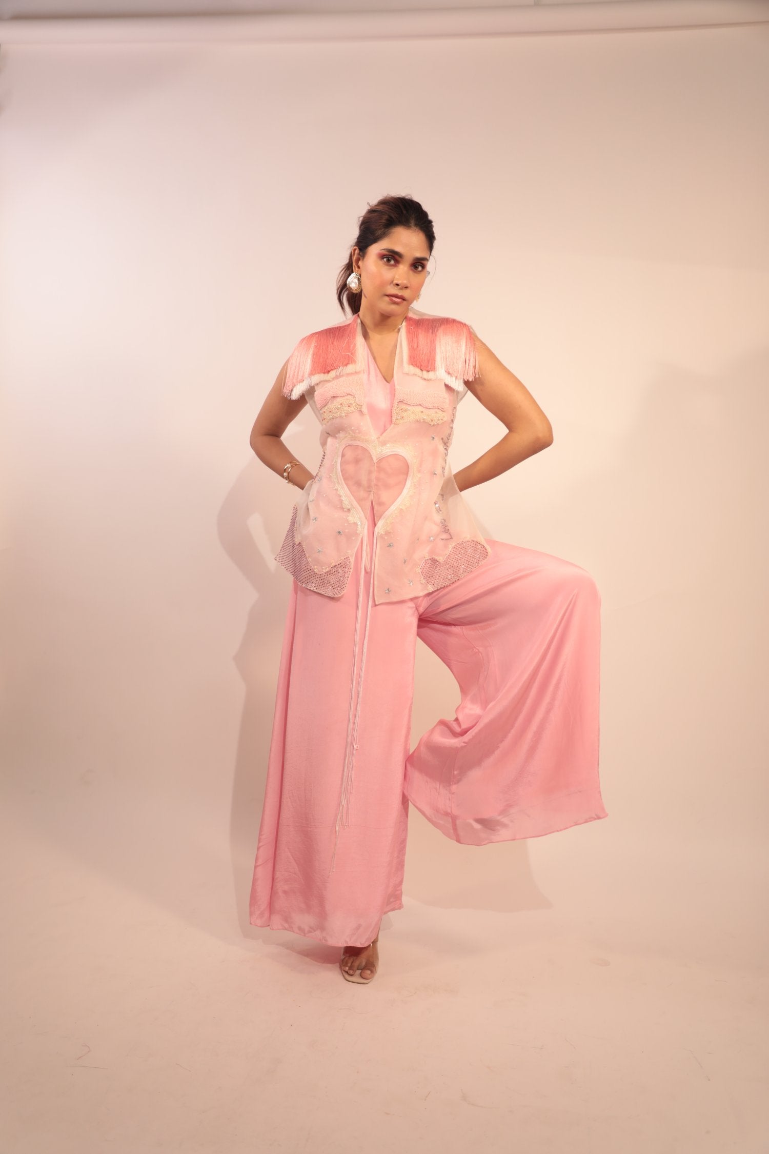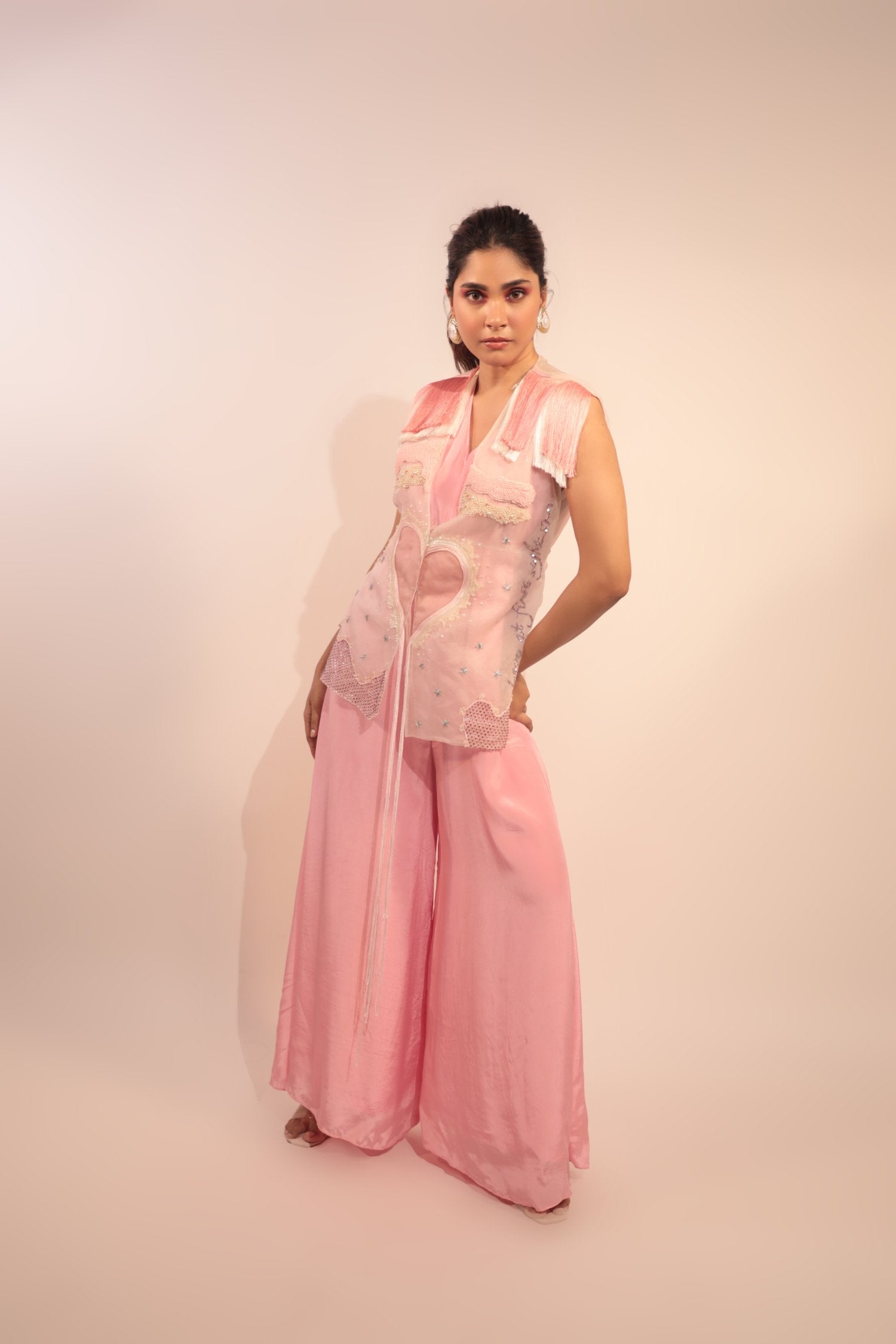 White & Baby Pink Jumpsuit With Fully Hand Embroidered Tassel Detailing On Tie-Up Organza Jacket.
