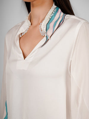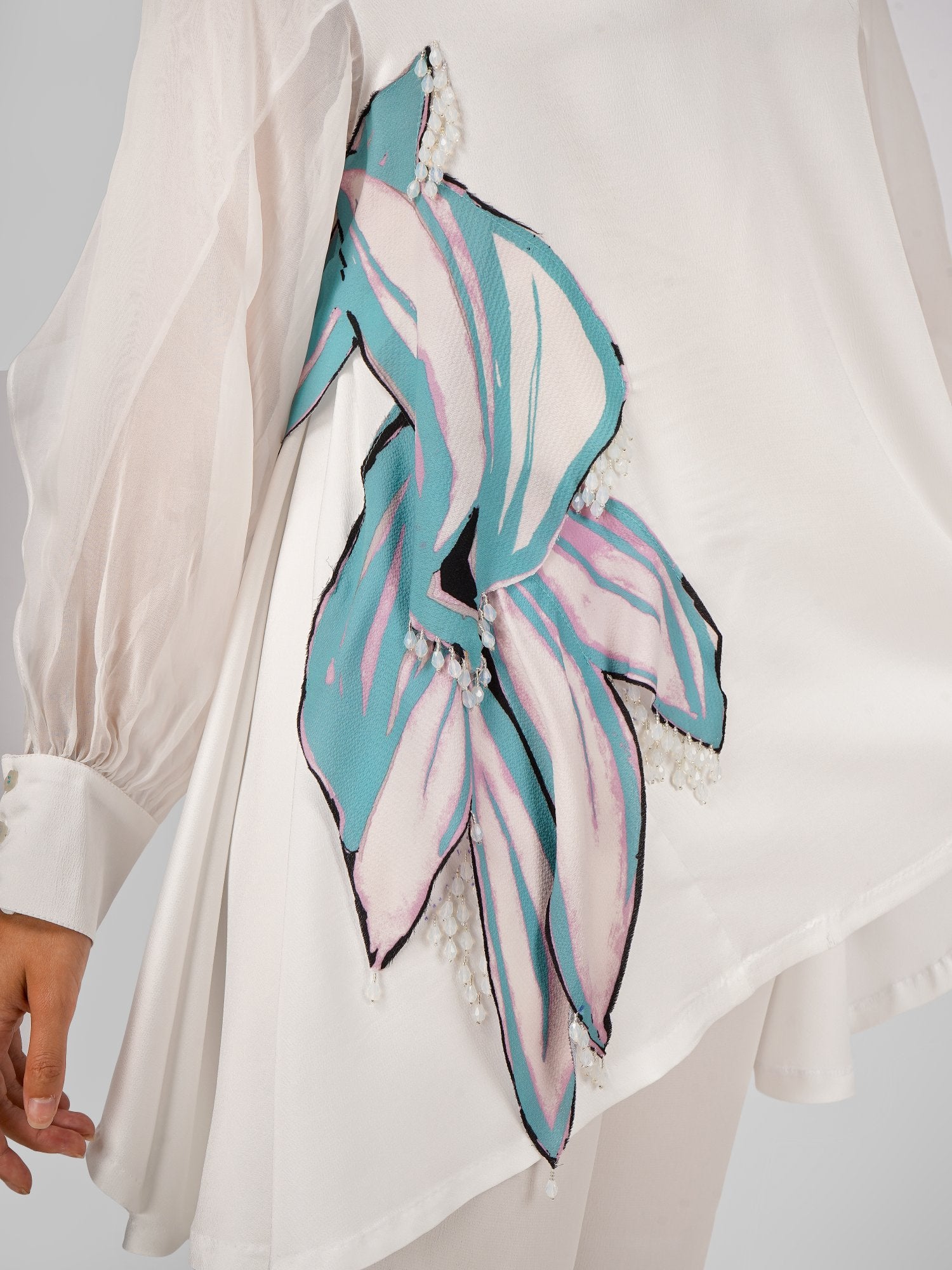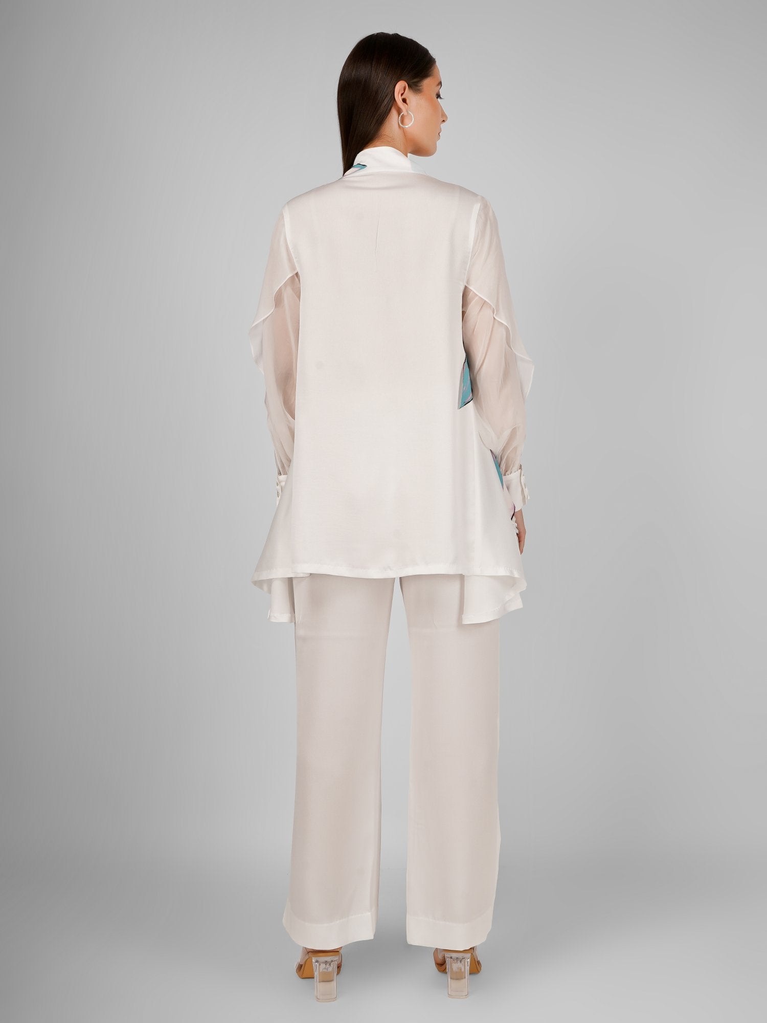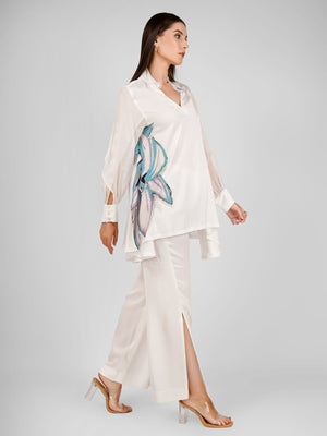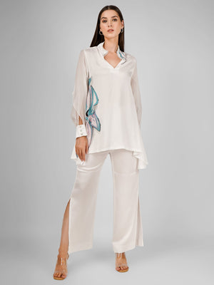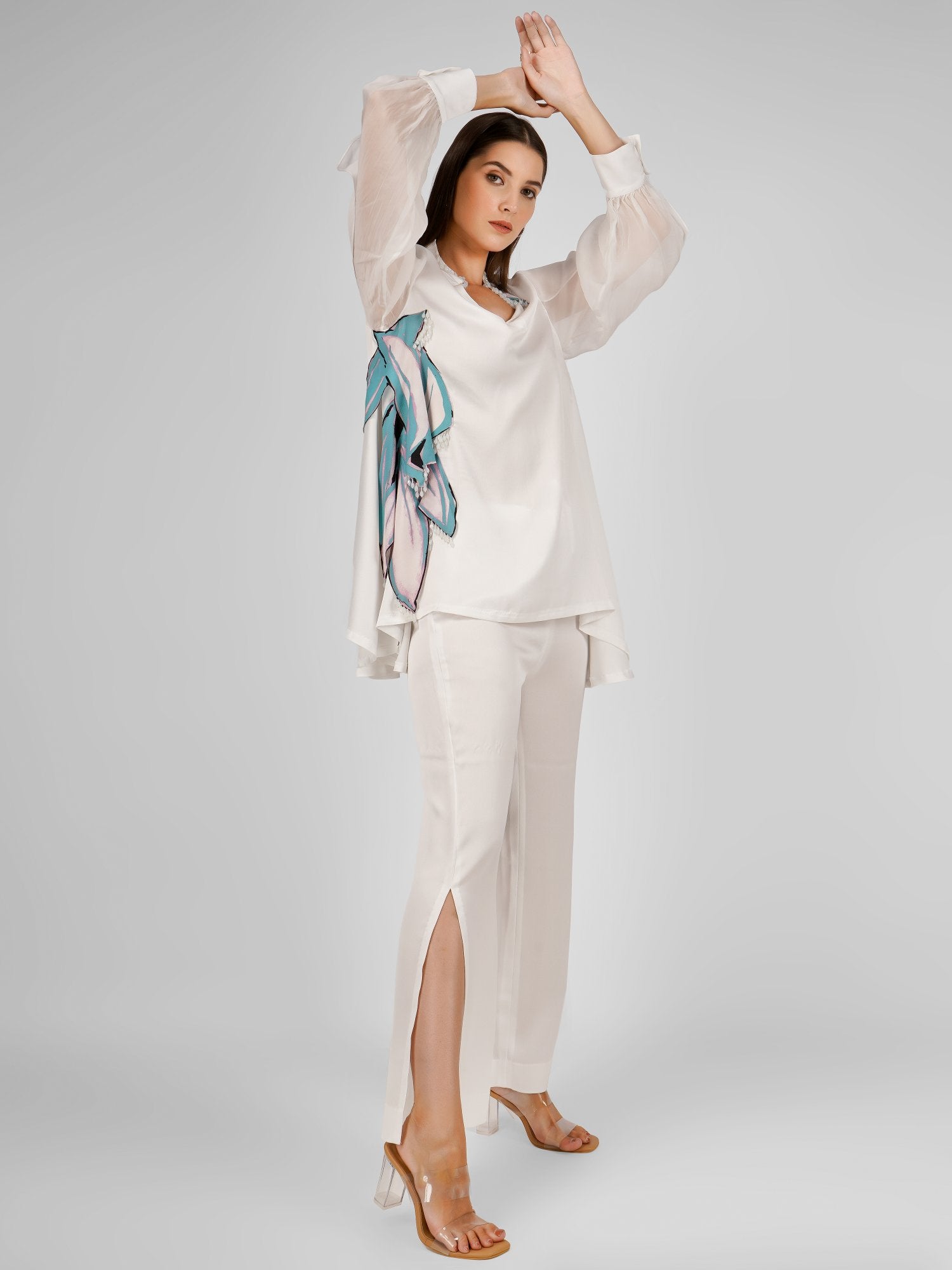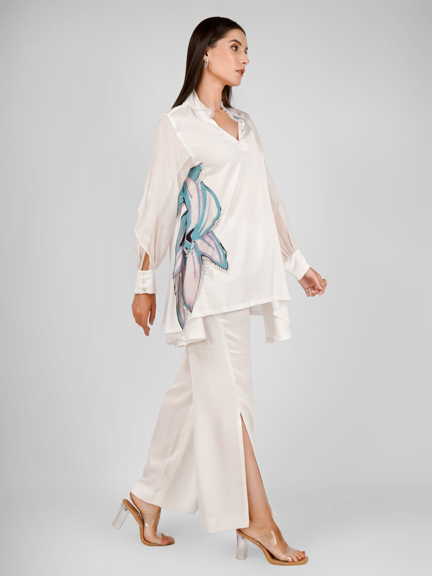 Poly Crepe and Organza with floral Appliqué work and drop hangings. Pants are straight has slit on sides
