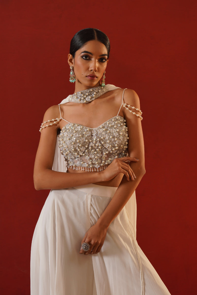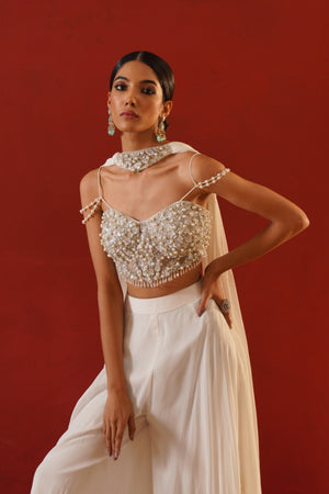 Kapda Dori's stunning white geogratte sharara. The white color adds a touch of glamour and sophistication to your look, while the soft fabric ensures you feel comfortable all day or night long. It is styled with a white net blouse hand embroidered with beads, pearls, stones and sequins. Pair it with complimenting white chokar geogratte dupatta.