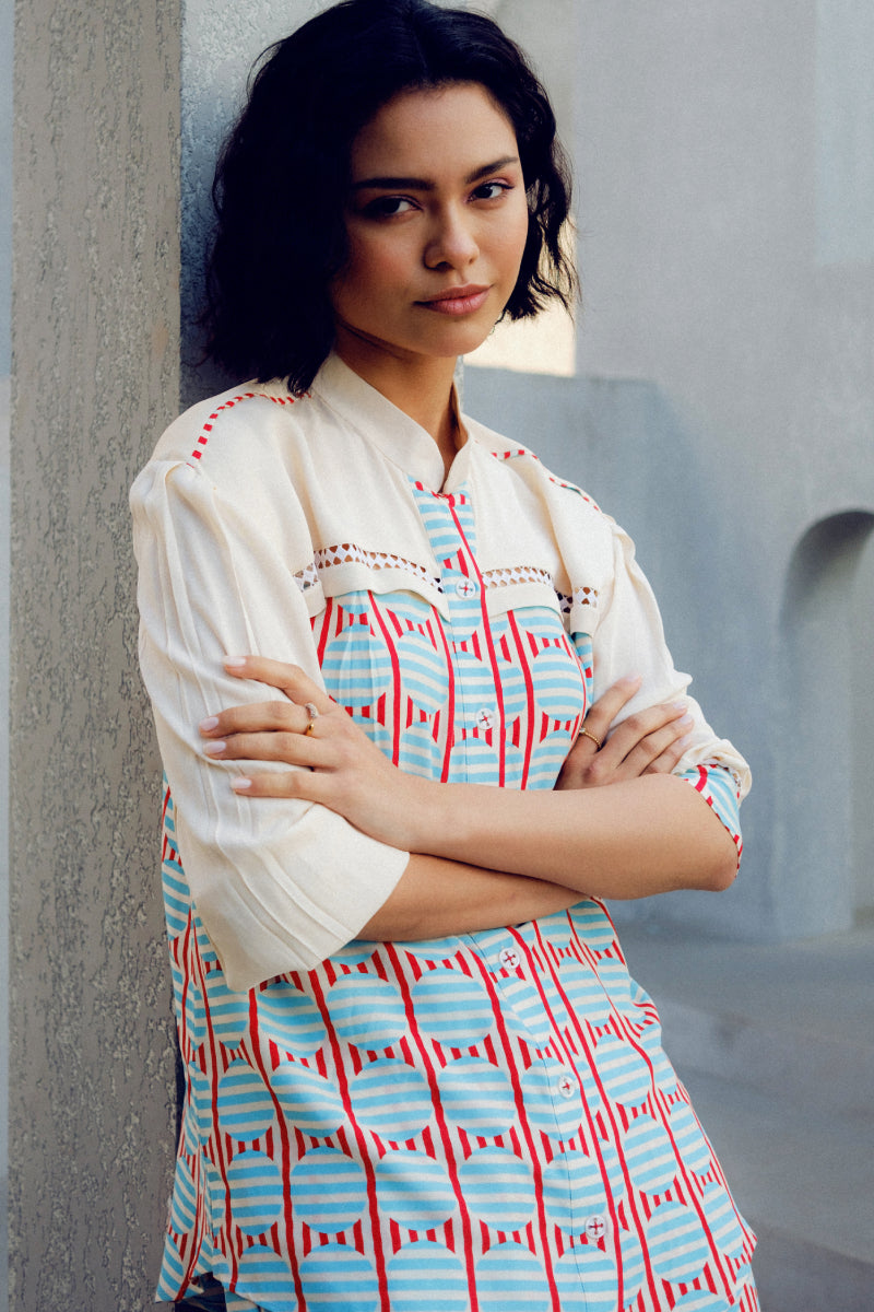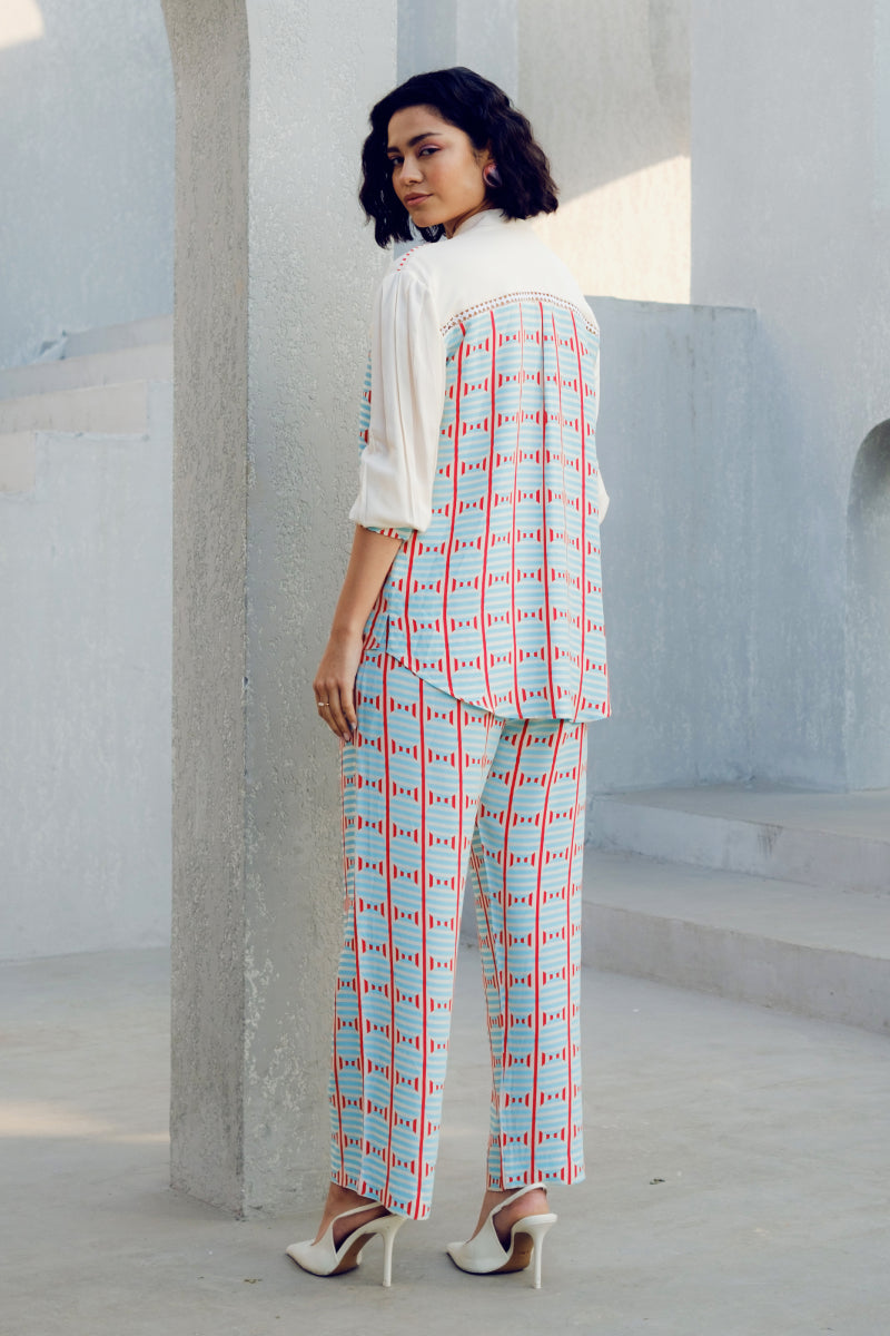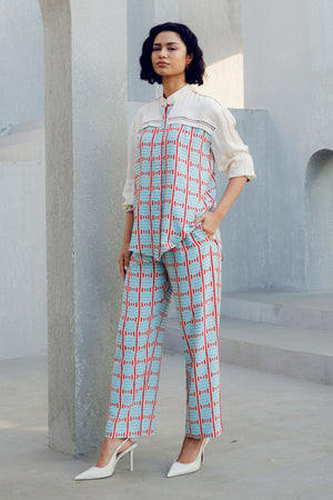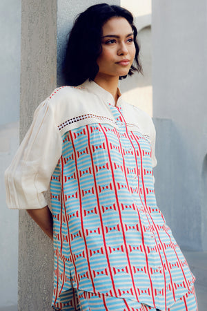 The White Illusion Lace Shirt is made of double georgette. It features a geometric print play and a contrasting white patch with lace detailing.