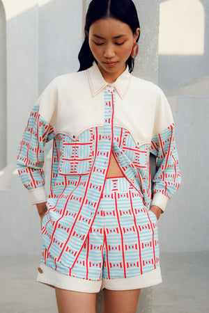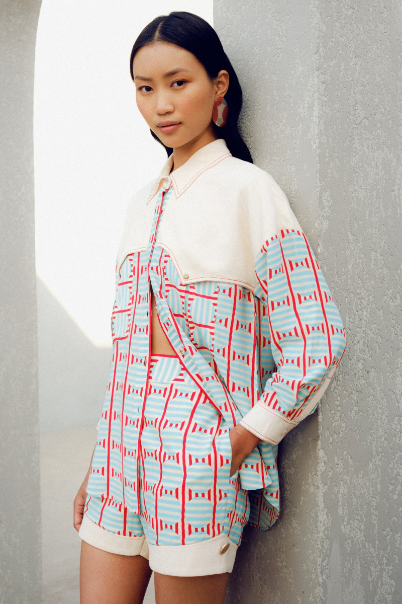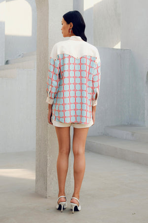 The White Illusion Shirt is made of double georgette. It features a geometric print play and a contrasting white patch.