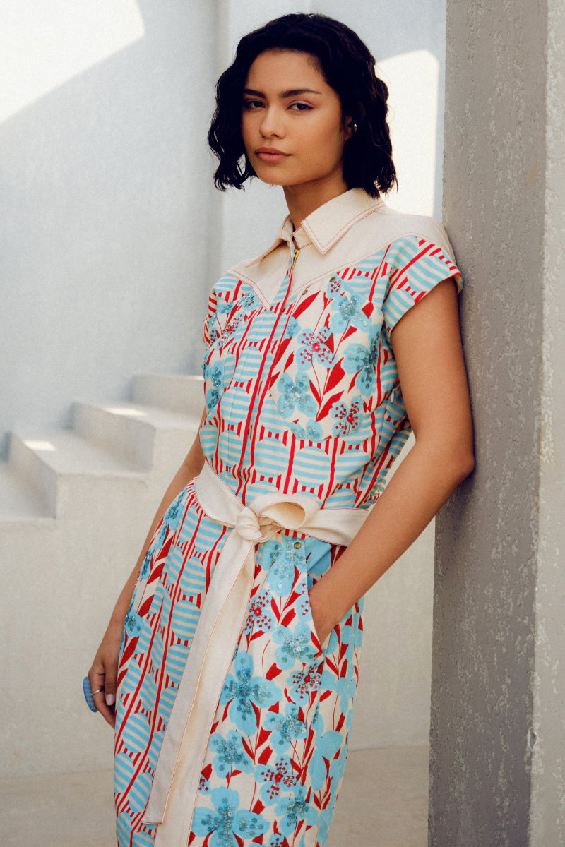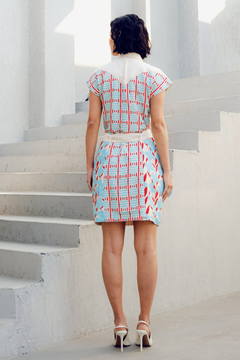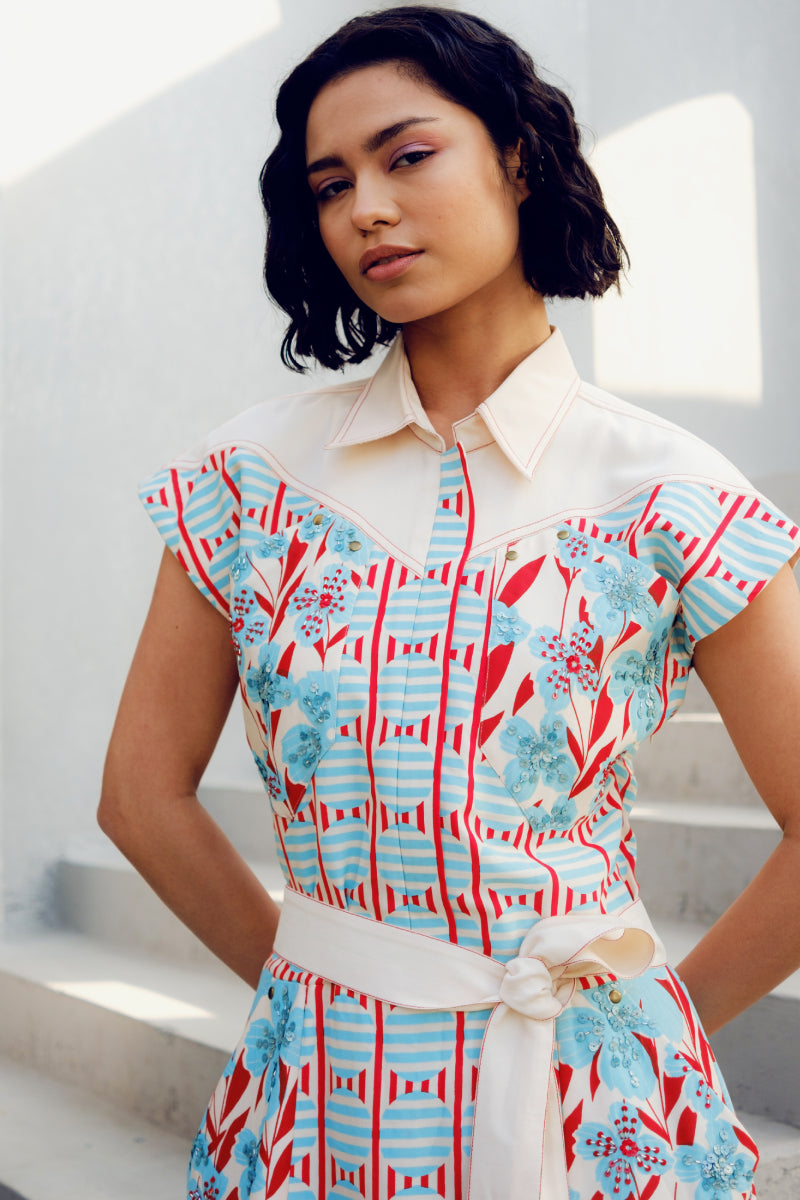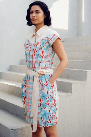 The White Print PLay Cargo Dress is made of double georgette. It features geometric and floral print play with a contrasting white tie-up detailing around the waist.