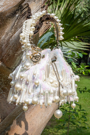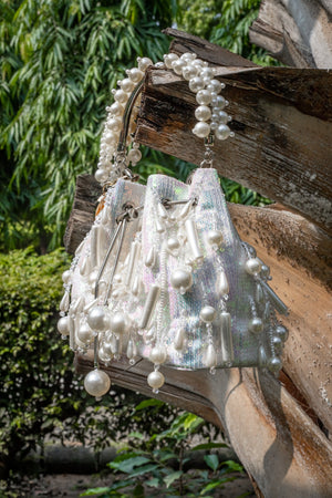 Inspired by traditional bags, Artisans in India and shaped to a lightweight structured form crystals Potli bags