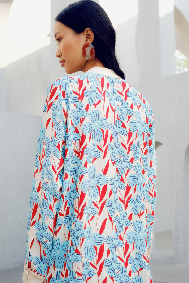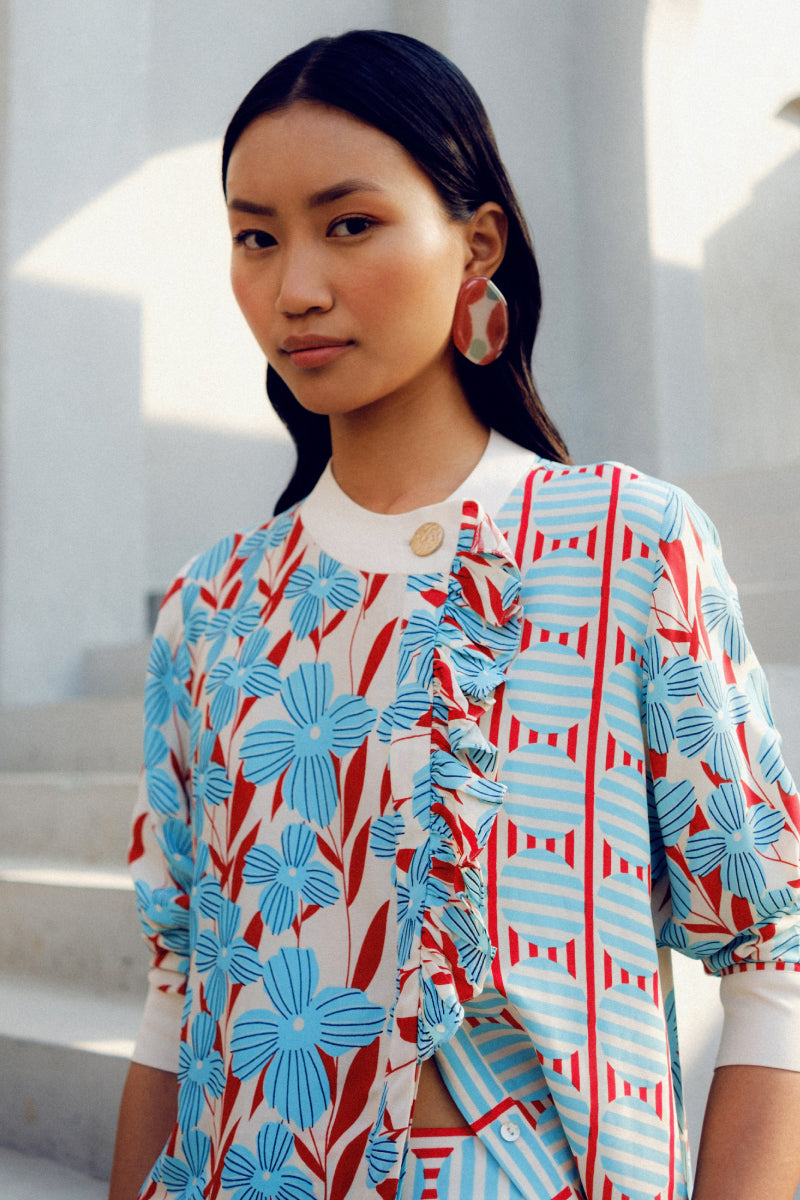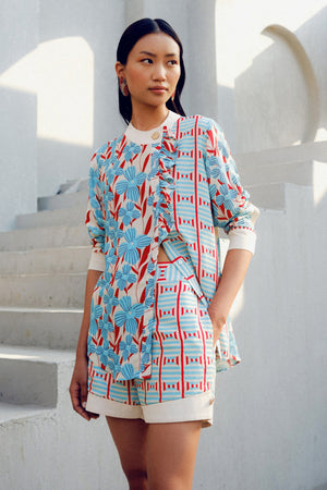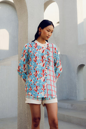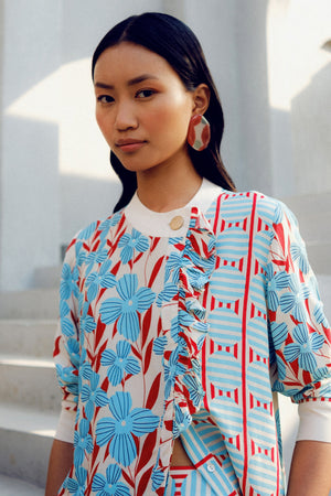 The White Print Play Frill Shirt is made of double georgette. It features both floral and geometric prints in classic PRG style and some additional frill detailing.
