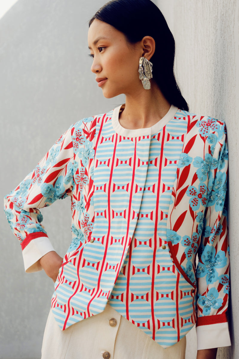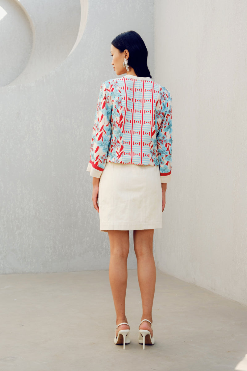The White Print Play Jacket is made of double georgette. It features both floral and geometric prints in classic PRG style.
