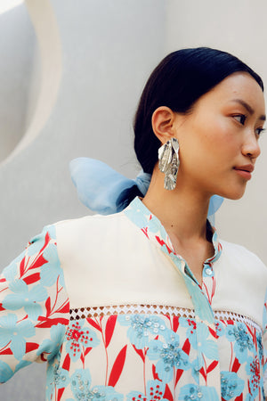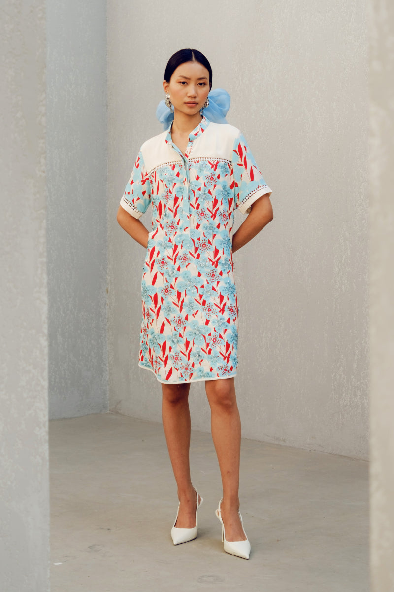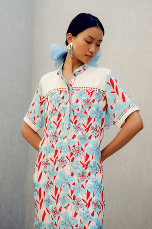The White Print Play is made of double georgette. It features a mandarin collar, floral prints and a contrasting white patch on the bodice.