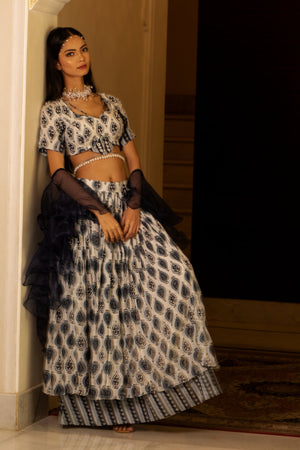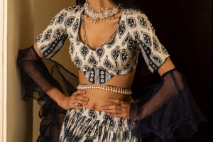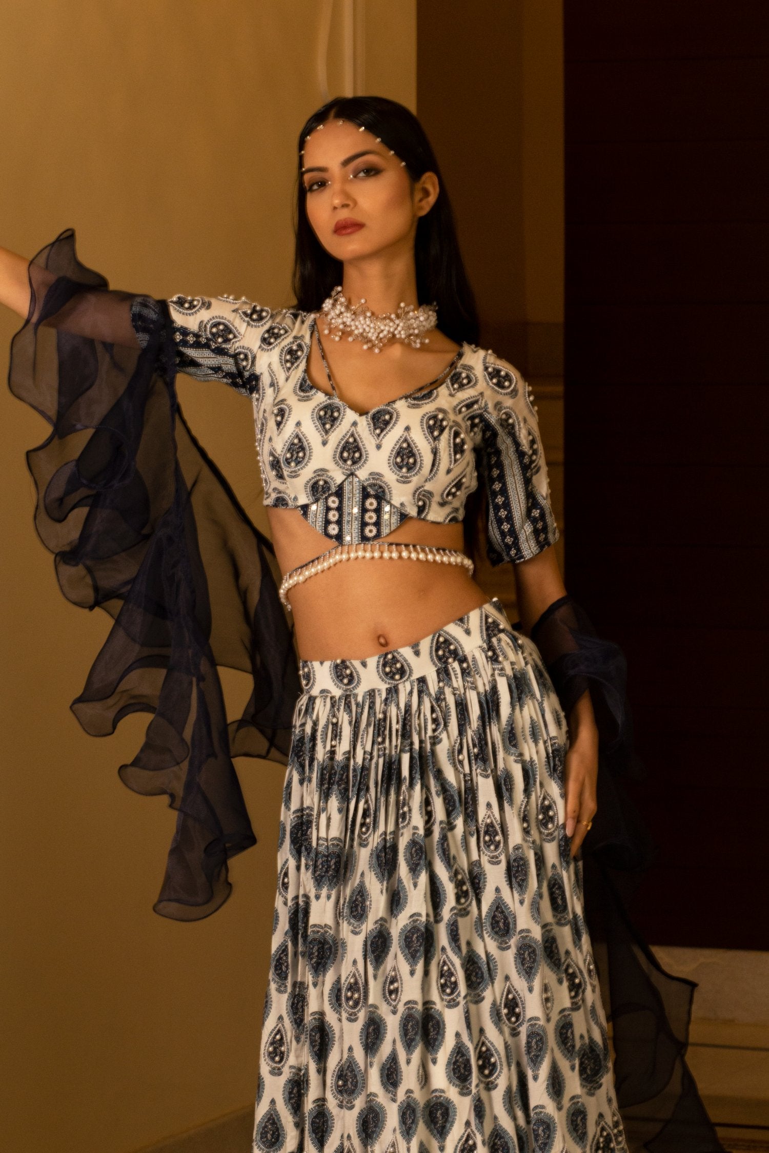 White printed embroidered skirt with embroidered blouse with tie-at-waist detail and blue organza ruffle dupatta. The whole set is embellished with moti work all over.