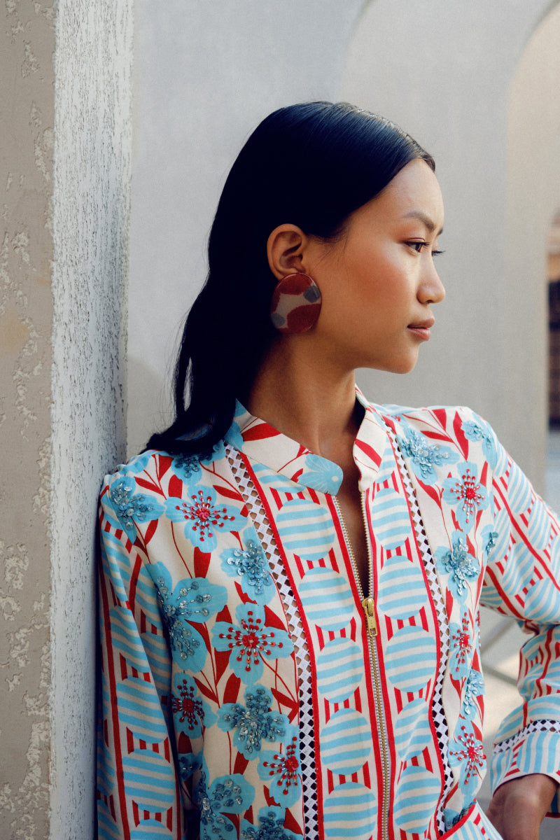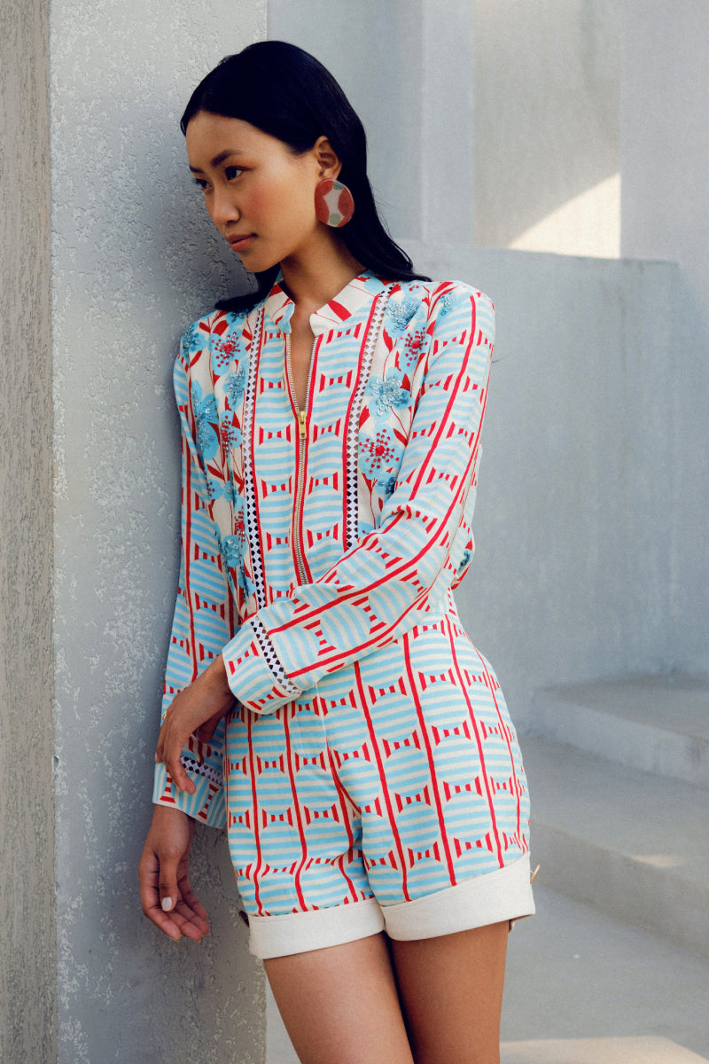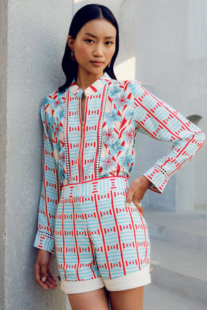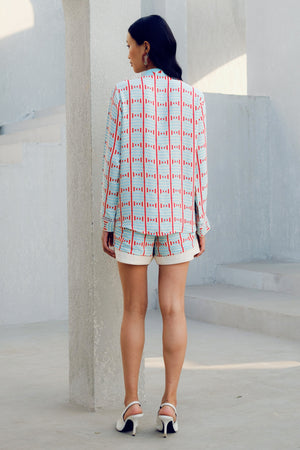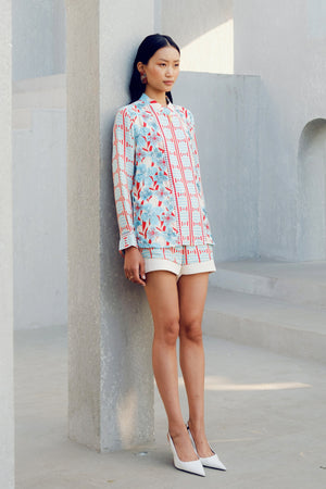 The White Zip Shirt is made of double georgette. It features a mandarin collar and zipper detailing with floral and geometric print play in classic PRG style.