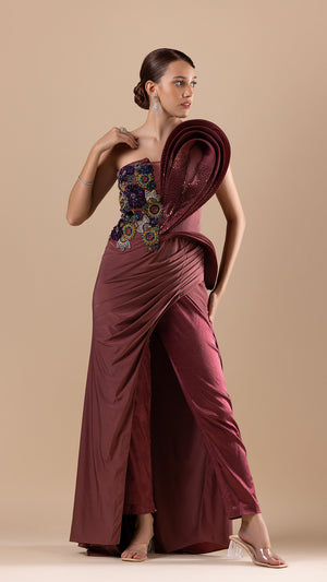 Wine Embroidered Tube Dress With Pants