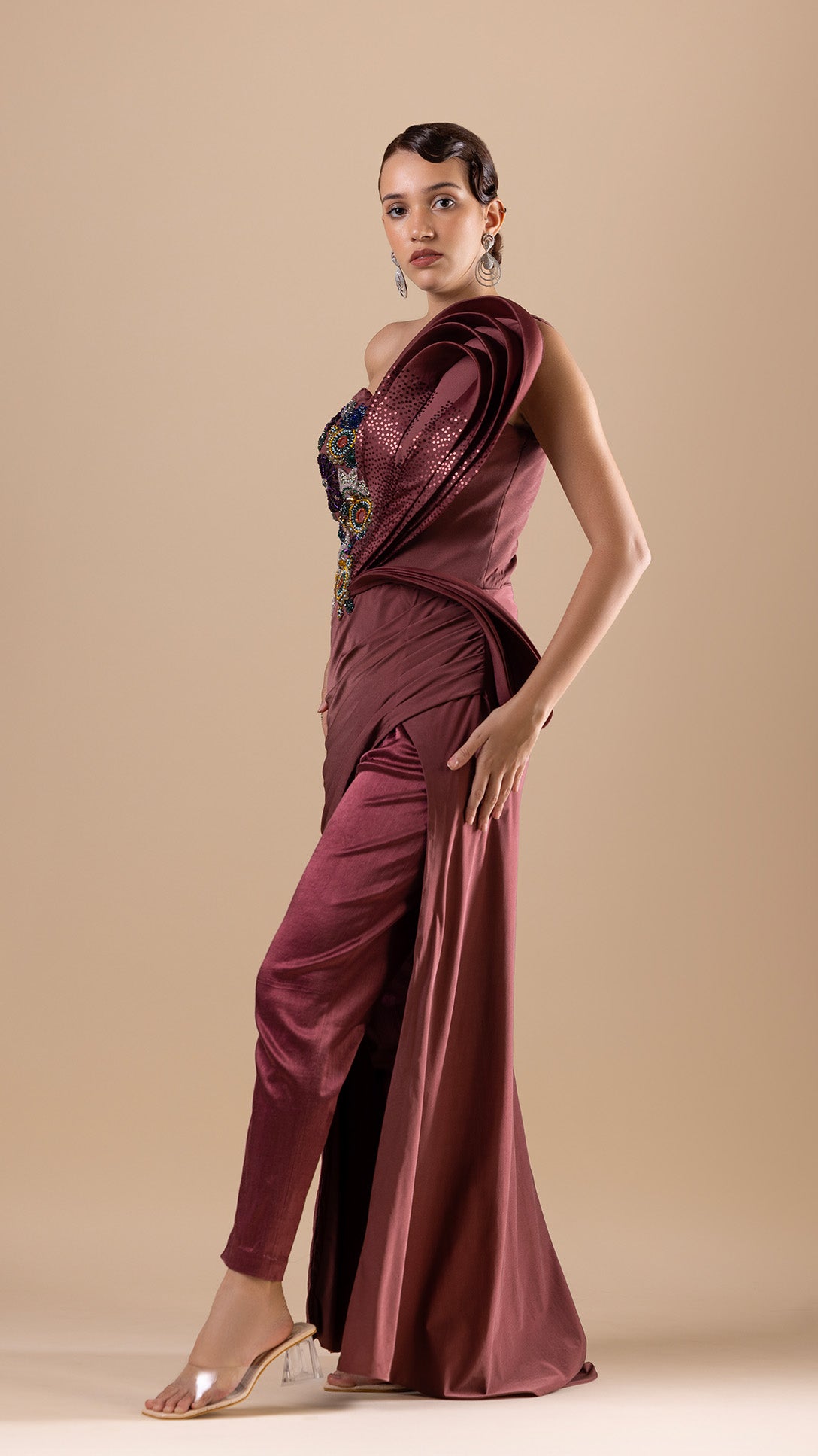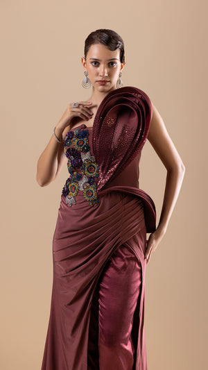 Wine tube dress in Organza and lycra with embroidered crystal, cutdana, sequins, and Swarovski detail. Paired with matching pants
