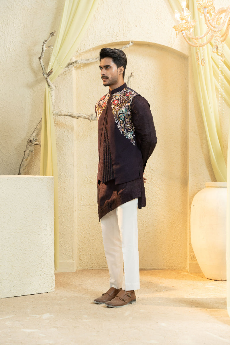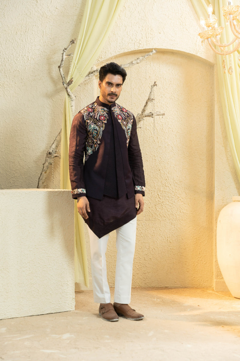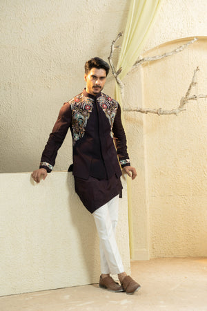 The Wine Hand-Embroidered Bundi Set brings together regal elegance and refined craftsmanship. A rich wine Bundi jacket is adorned with meticulous hand-embroidery, layered over a crisp kurta and tapered trousers for a balanced, structured look. Designed for weddings, receptions, and celebratory evenings, this set is both timeless and versatile, complementing the season’s warm festive palette.