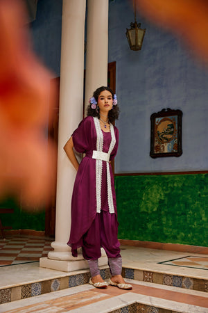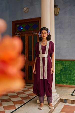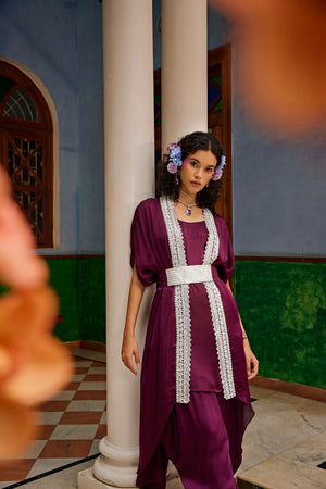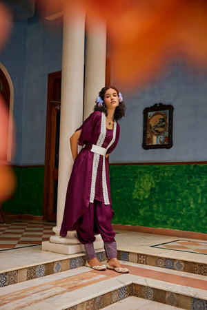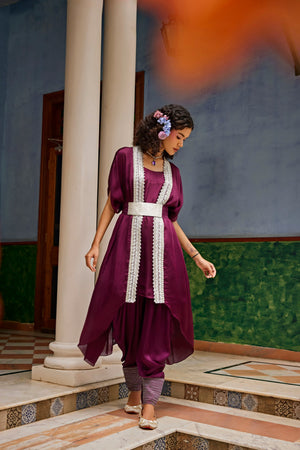 Elevate your allure with our reddish wine satin organza cape jacket, adorned with exquisite bead and zardozi embroidery. Paired flawlessly with a belt, complemented by a satin organza pant. This ensemble exudes opulence, perfect for sophisticated events, cocktail parties, and upscale gatherings. Elevate your presence with this luxurious attire that captures attention and admiration. Model Info:
