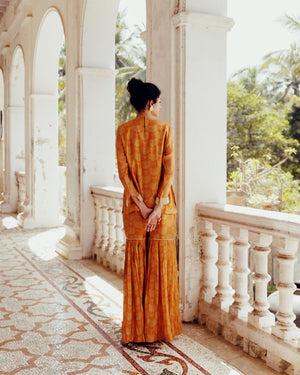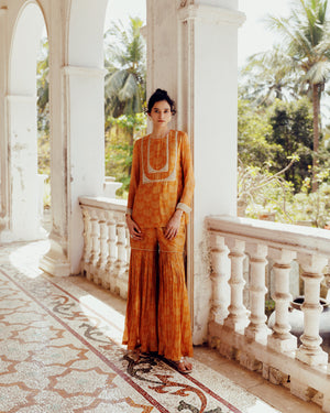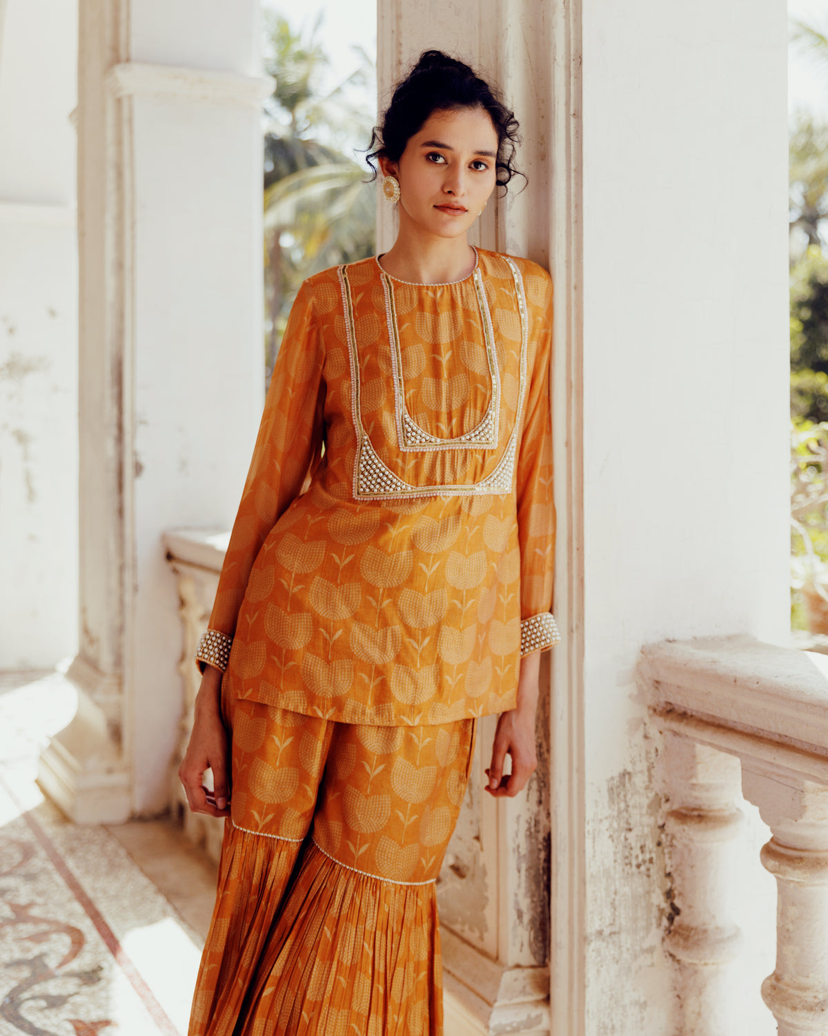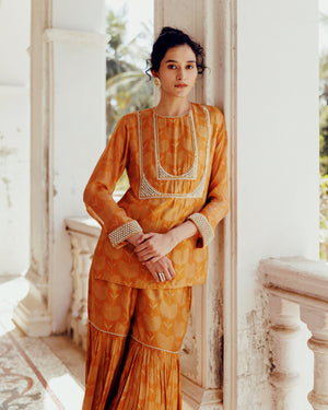 Rust Bandhani T Shirt Neck Short Kurta + Pleated Sharara