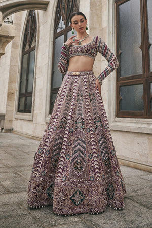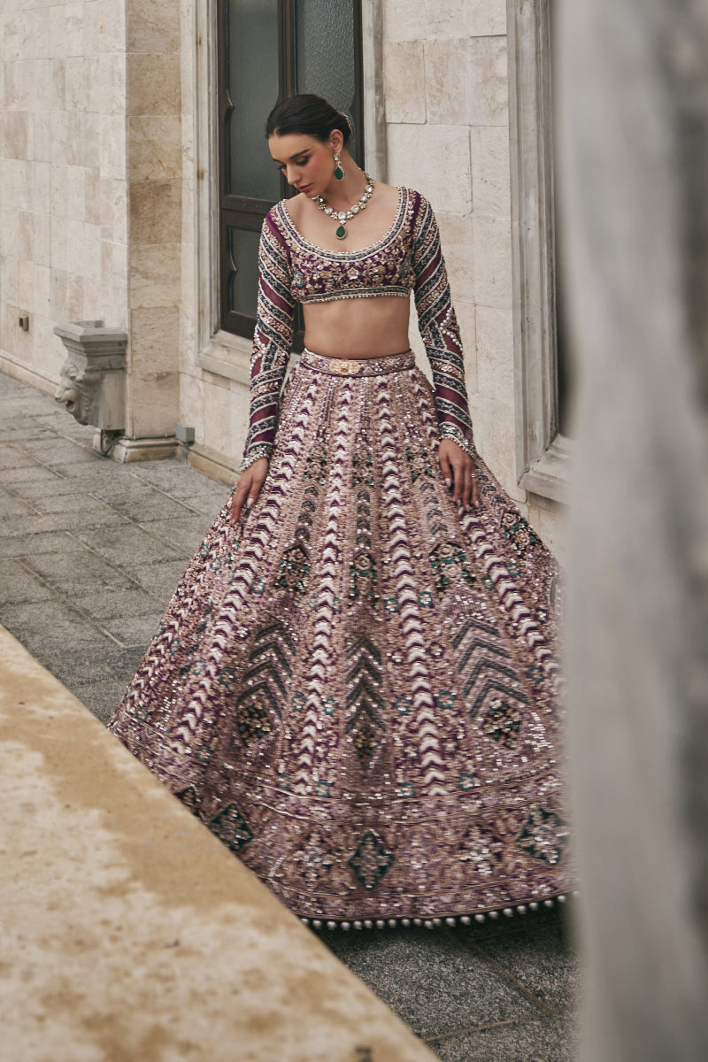 A festive deep berry wine lehenga paired with rich deep teal green velvet appliqué on the lehenga, dupatta, and blouse sleeves. The embroidery is regal, featuring zardozi with elegant pearls and subtle glass beads, flowing vertically for a lengthening effect. The blouse has a modern twist with V-shaped patterns on the sleeves, elongating the arms while maintaining elegance. The overall look is a blend of classic richness and contemporary finesse. perfect for a bride who wants timeless charm with a bold, royal edge