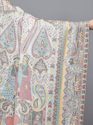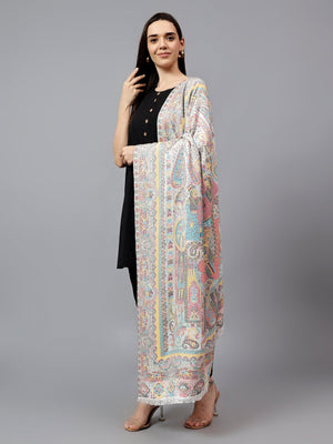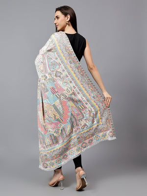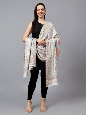Women Fine Wool Kani Weave with Ethnic Mughal Darbar Extra Soft & Warm White with Multi Luxury Shawl