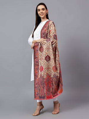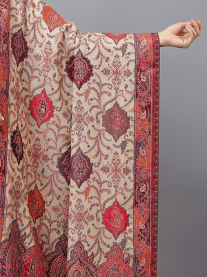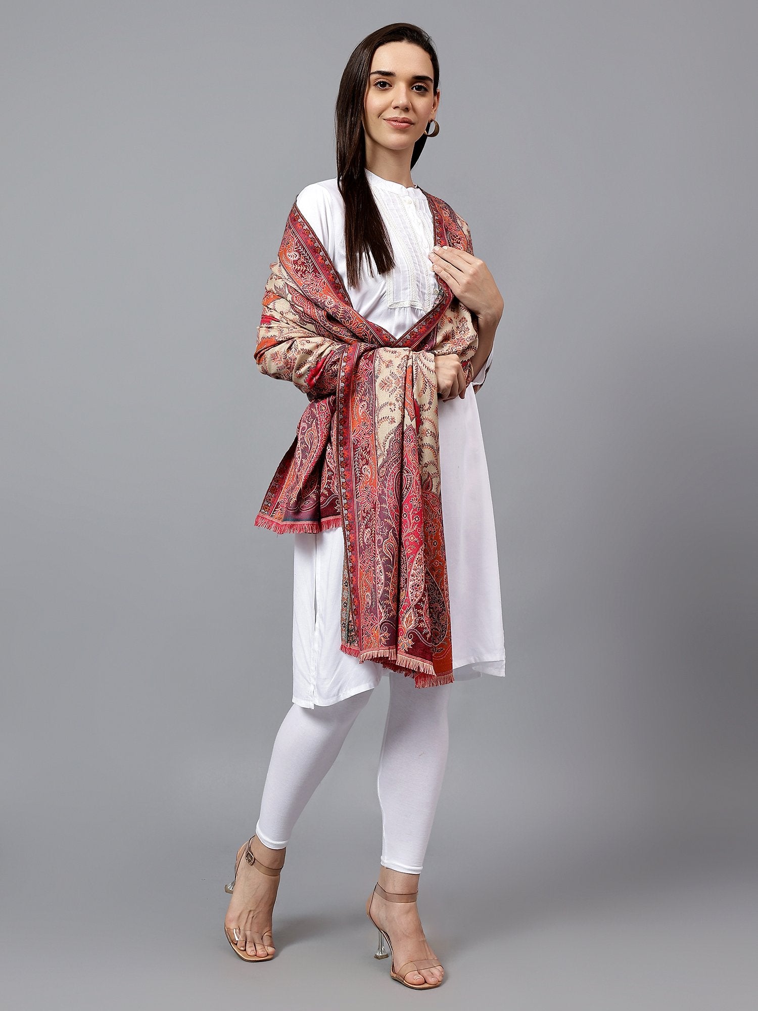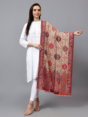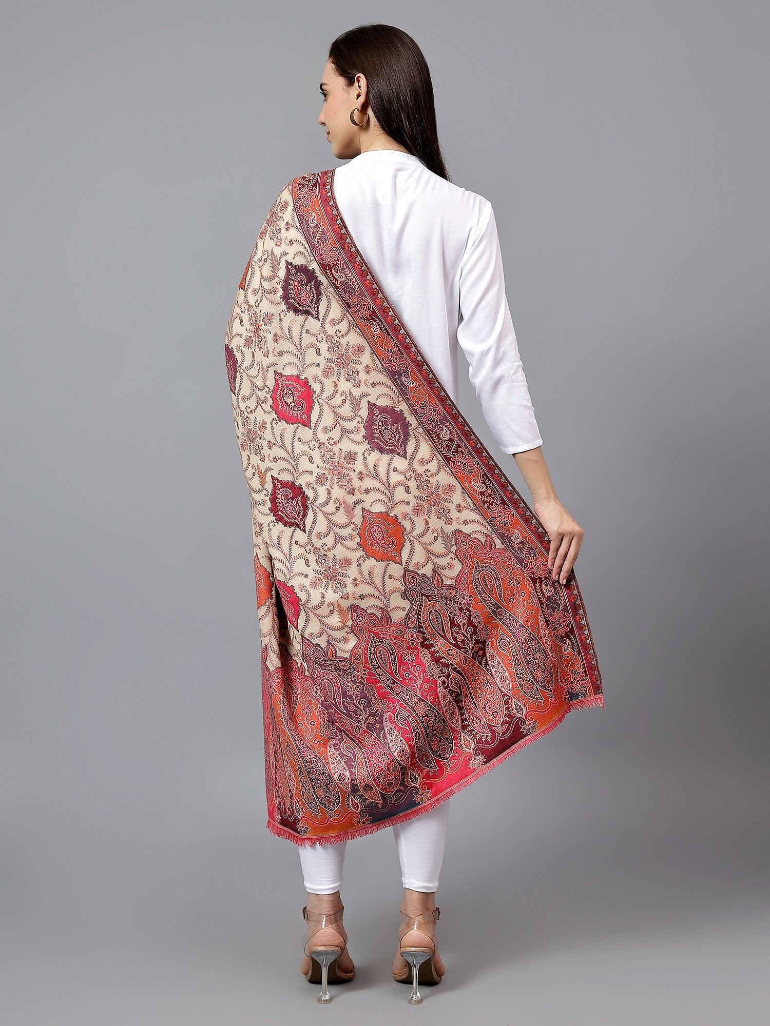 Women Fine Wool Ethnic Weave Paisley with Contrast Designer Border Soft & Warm Beige Shawl