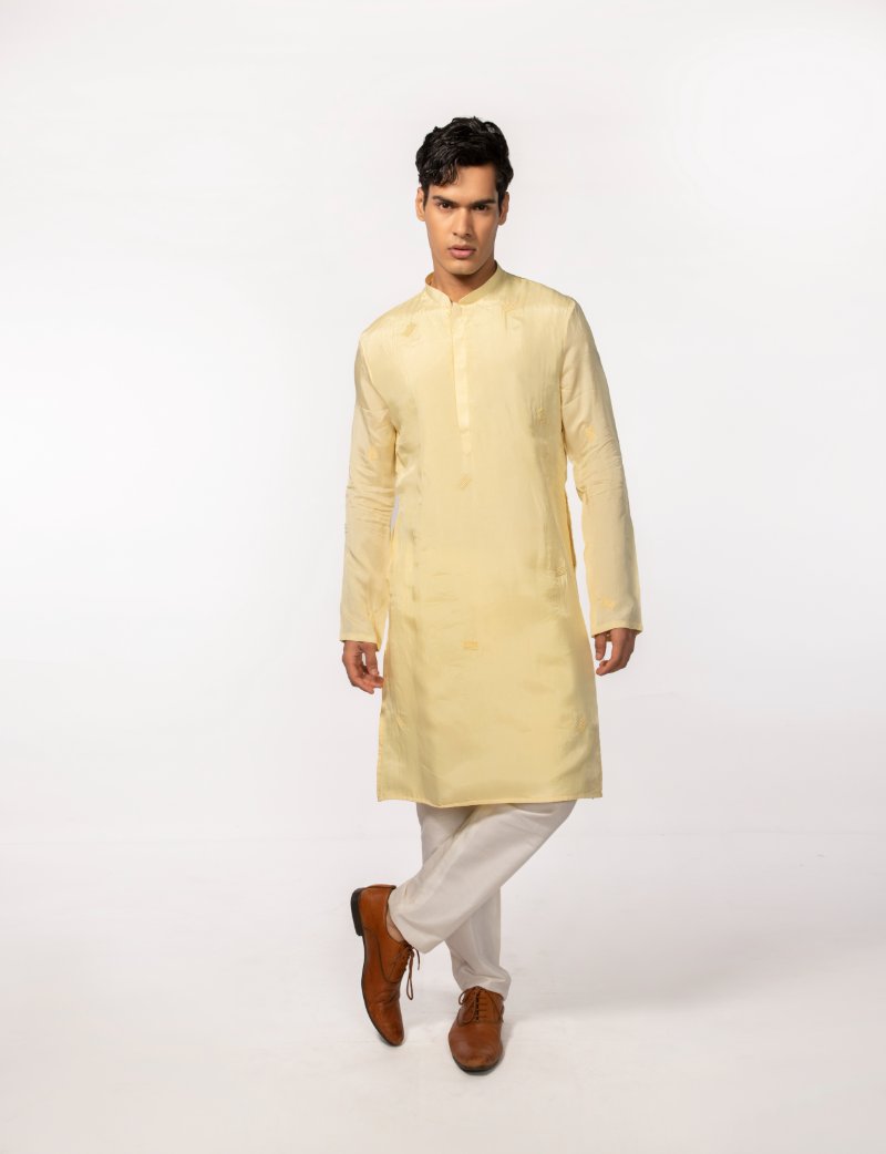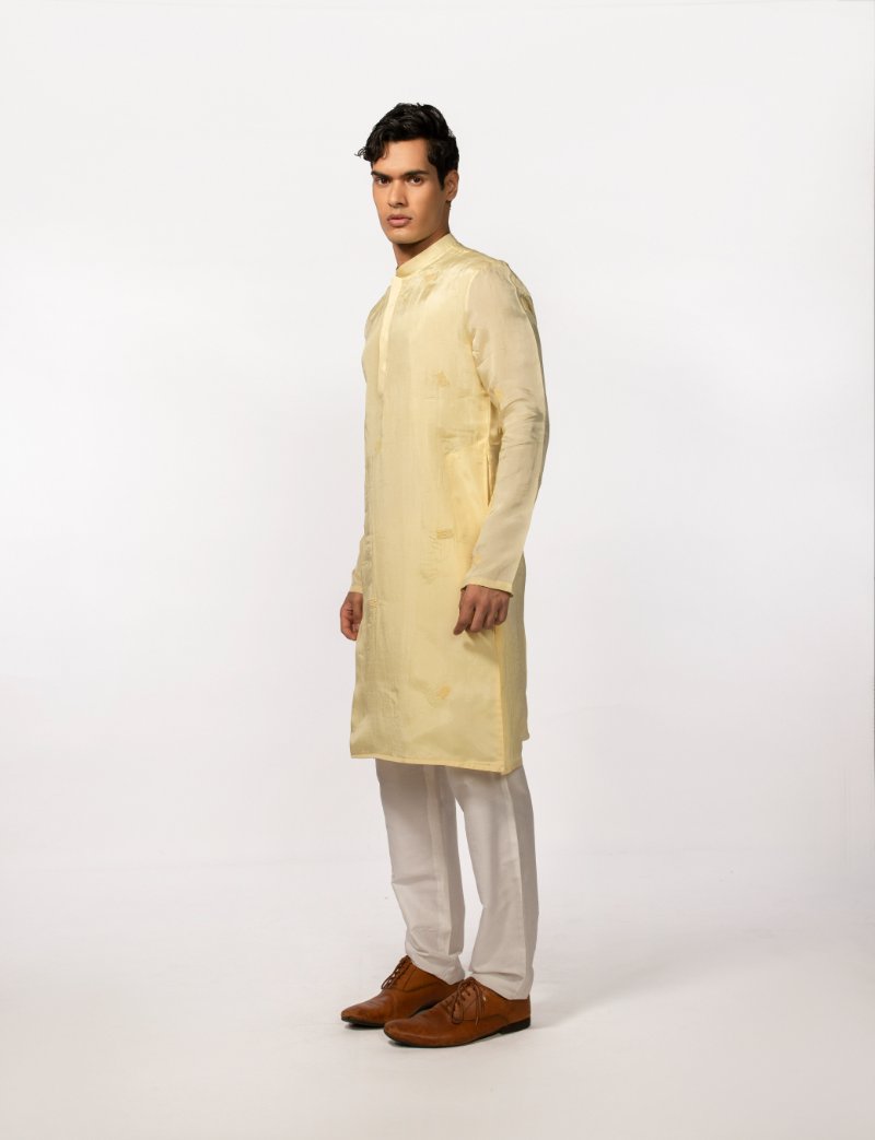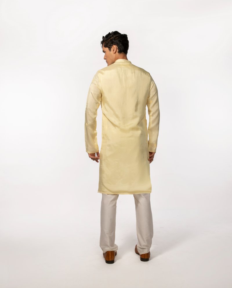 Yellow kurta with intricate beads embroidery placed all over is paired with pant pajama.Kurta Length- 44''. **The color may slightly vary due to screen lighting.