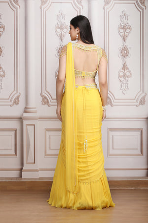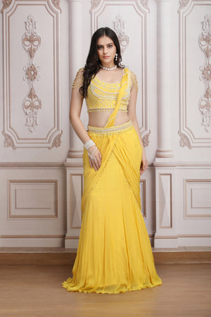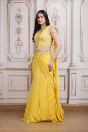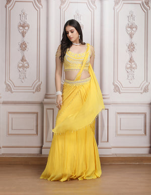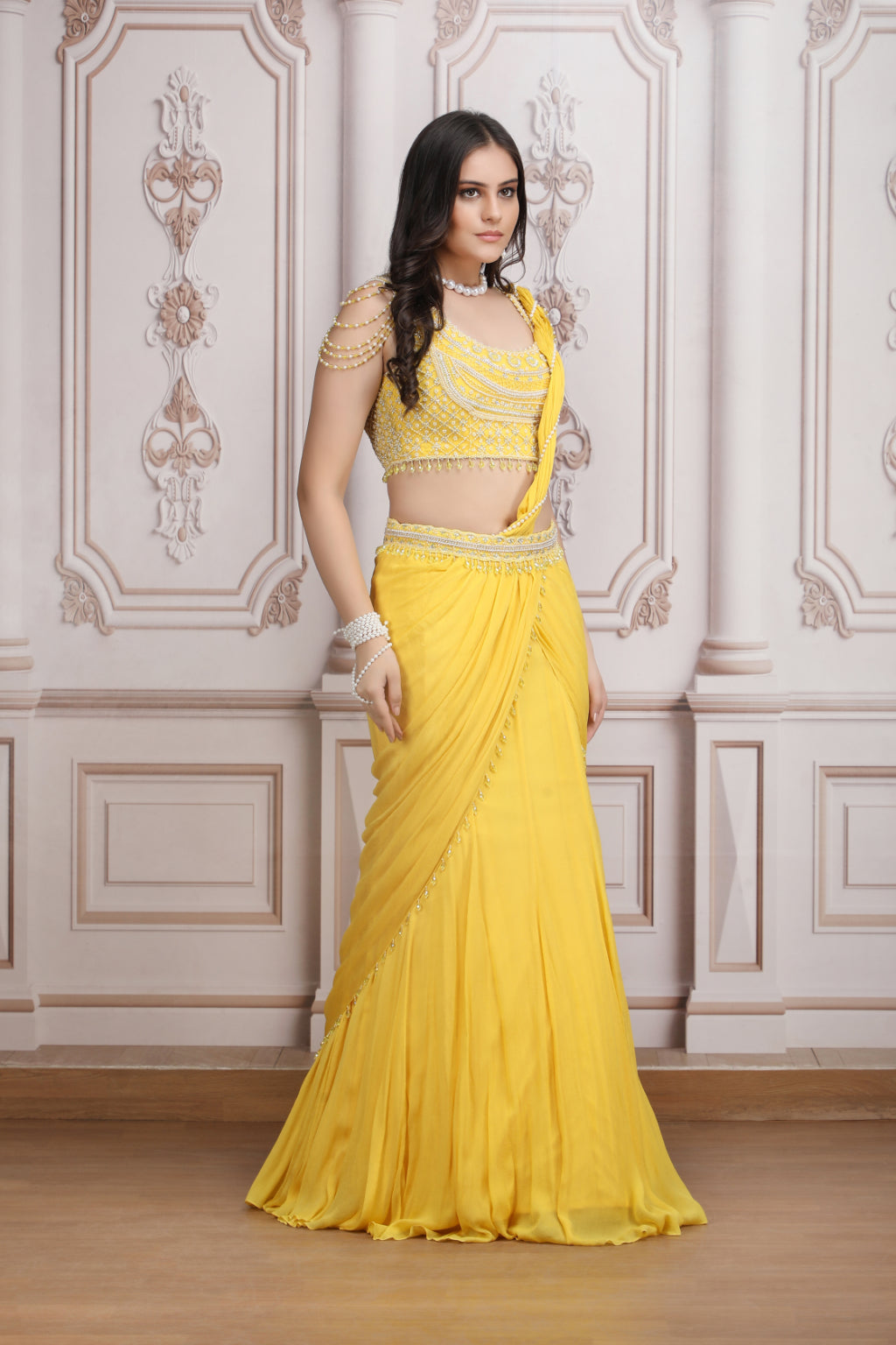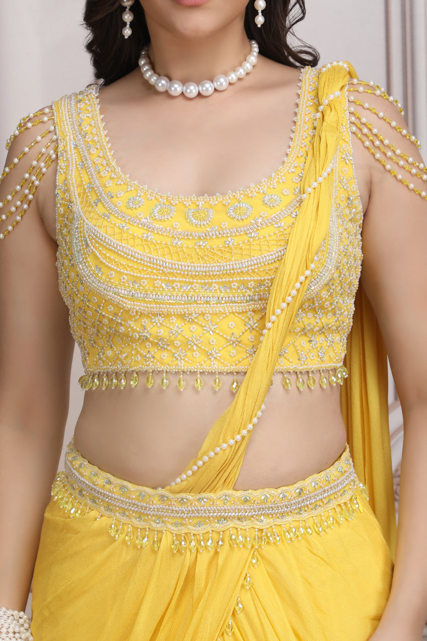 Yellow Drape Saree With Pearl Blouse