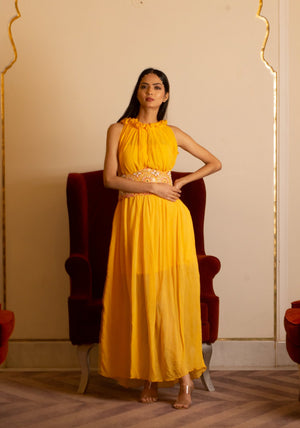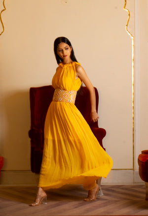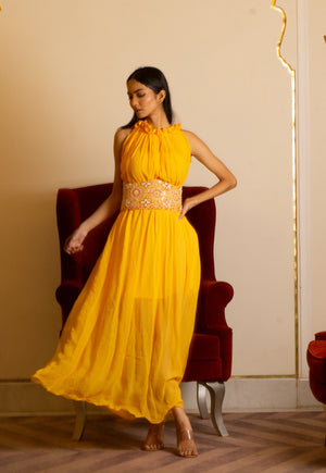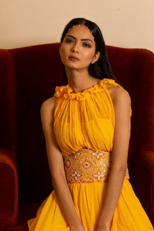 Yellow georgette dress with gathering detail on neckline and waist comes with an embroidered corset belt. The belt is embellished with mirror, moti and dabka.