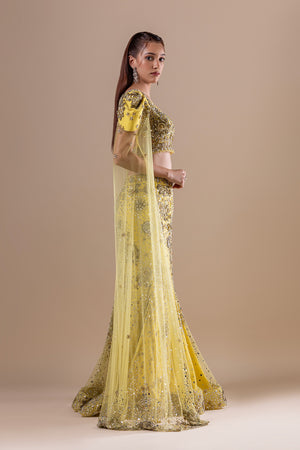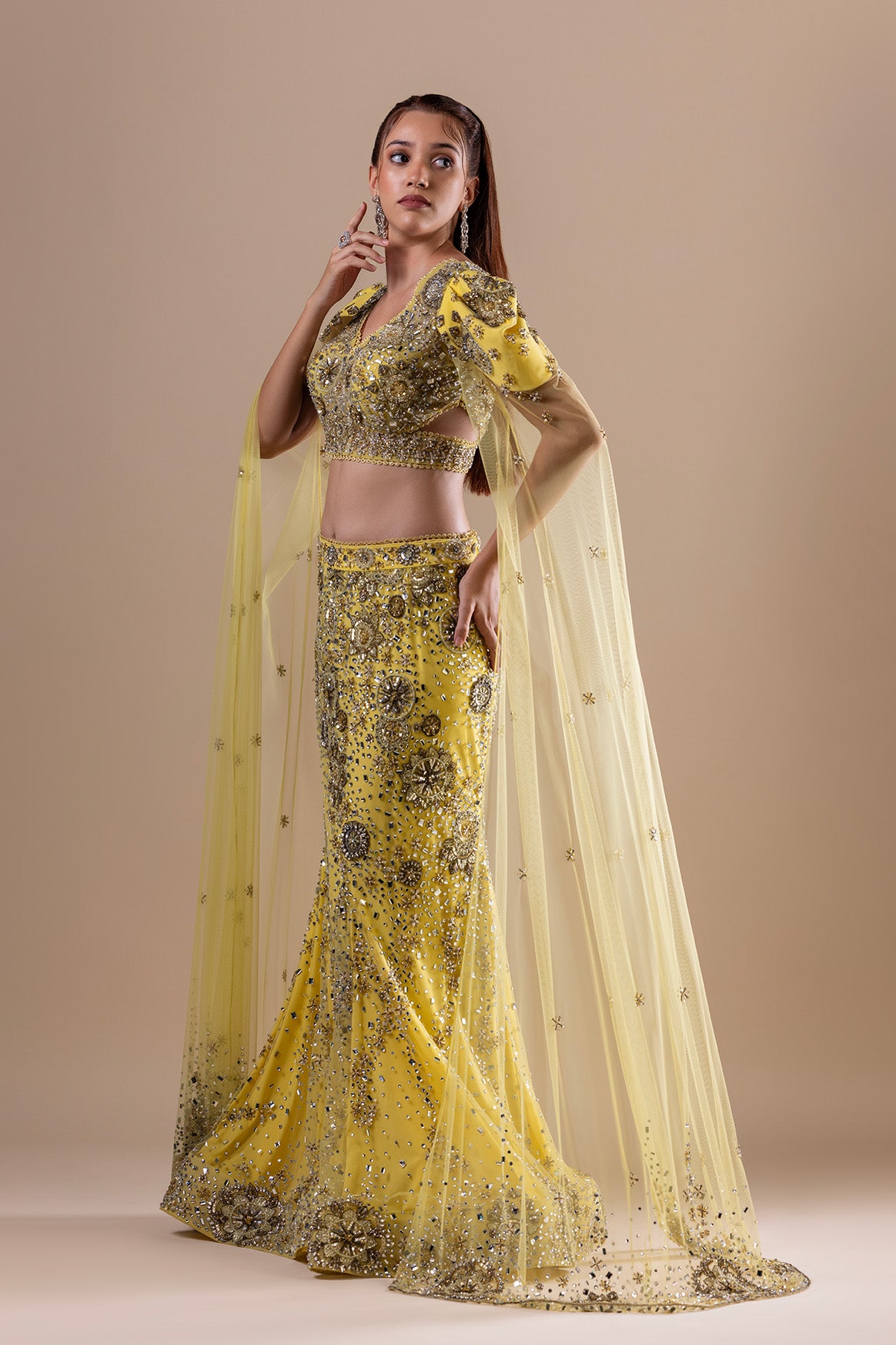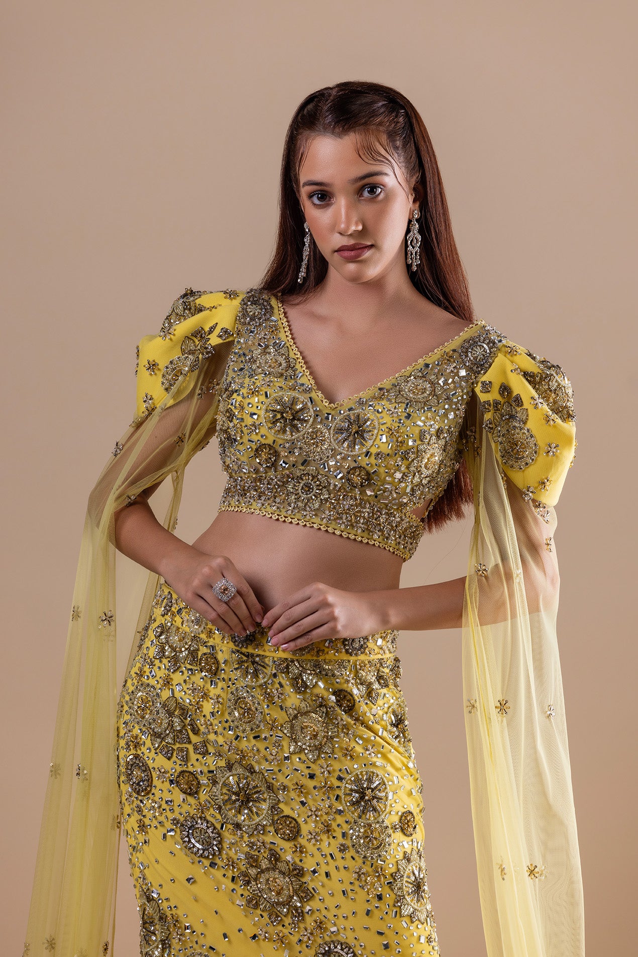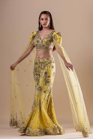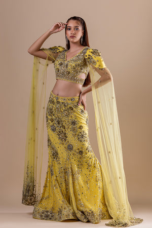 Lemon Yellow in net Skirt with crystal, cutdana, seqiuns and swarovski embroidery. Paired with a matching Embroidered Crop Top attached dupatta.